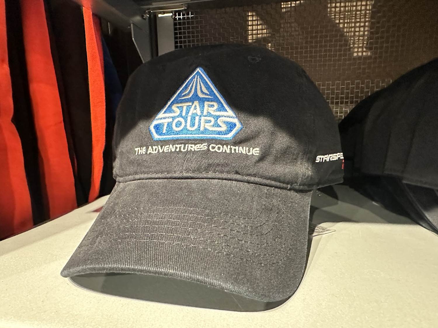 Fans can also get their hands on a more traditional baseball cap with curved bill that sports the Star Tours logo, with “The Adventures Continue" embroidered beneath.
