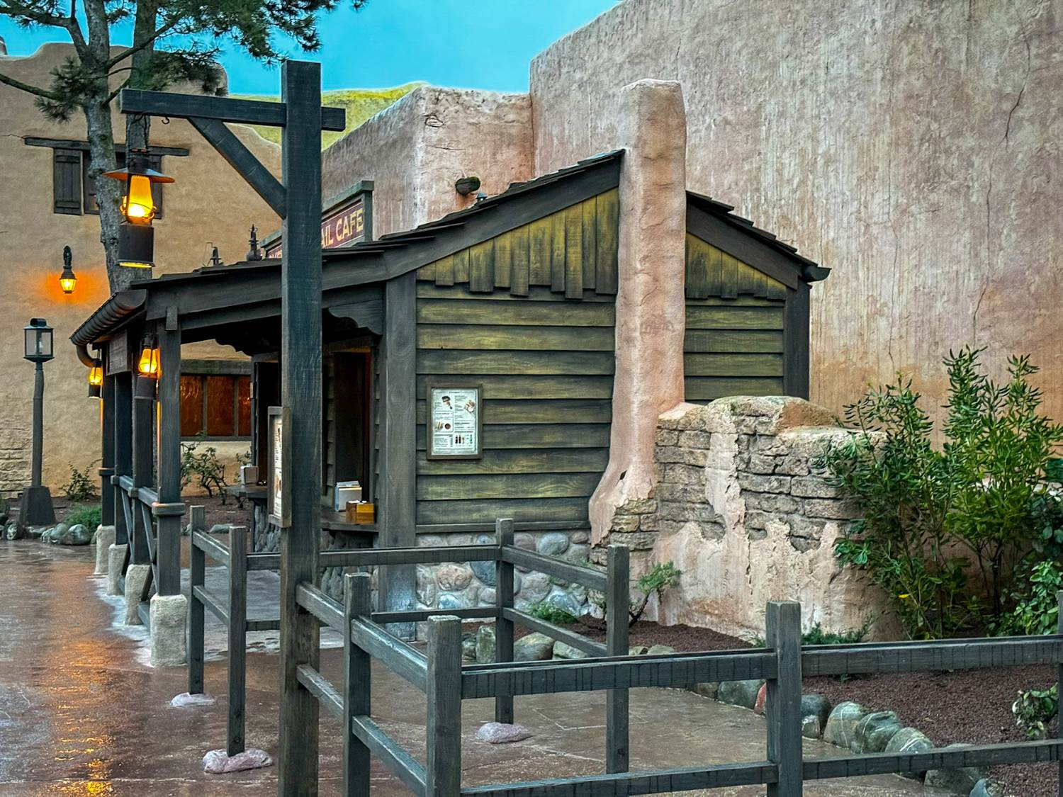 - The architecture of the kiosk blends the two main styles of the land's buildings, with the central part built in stone and wood, and the extremities in adobe, creating a natural transition between the Thunder Mesa entrance and the Pueblo-style facades, a blend typical of the Western films created in Europe, such as those by Sergio Leone. The wink doesn't stop there, as the list of stagecoach stops displayed on the kiosk's facade includes some of the most emblematic names of this beloved film genre.