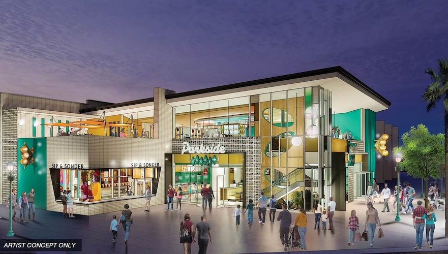 Located as part of the expansion of the west end of Downtown Disney at the Disneyland Resort, the new Parkside Market will feature four diverse culinary concepts from Levy Restaurants. Comparing the above image to the concept art for the location below, we can see that, at least with the exterior, things appear to be getting really close to completion.