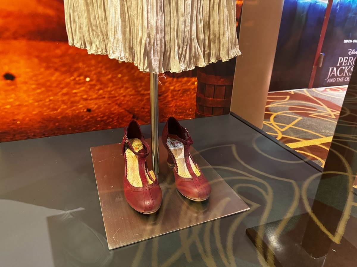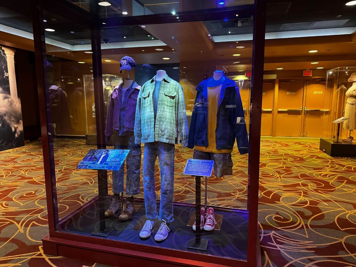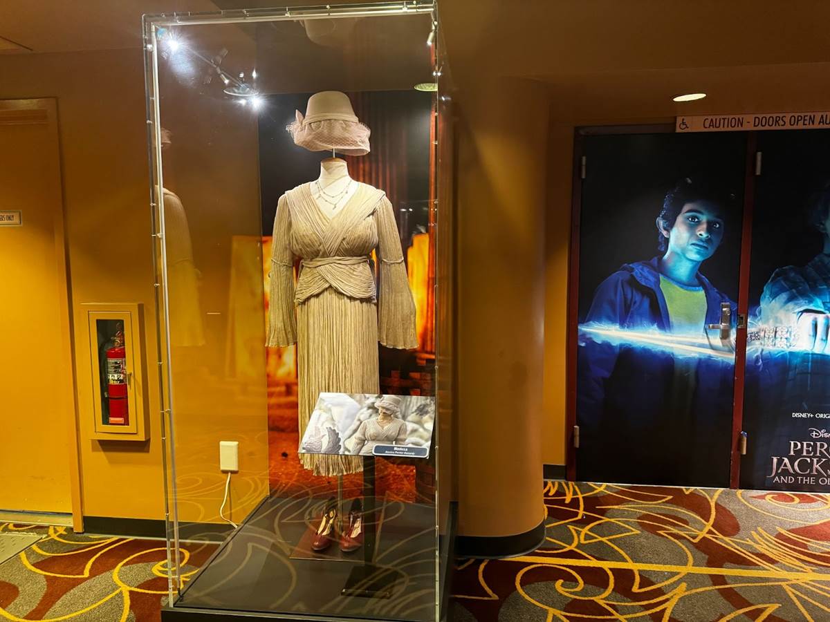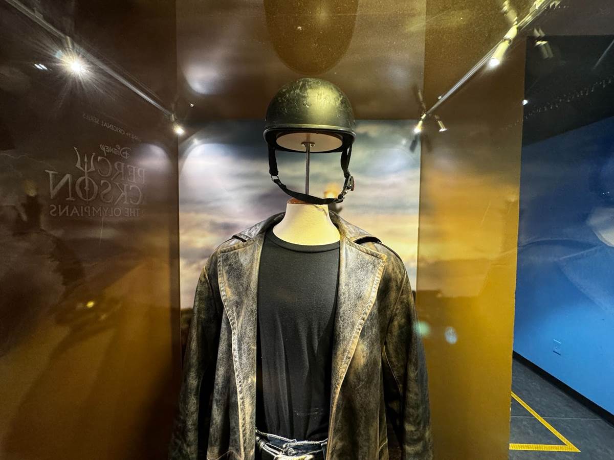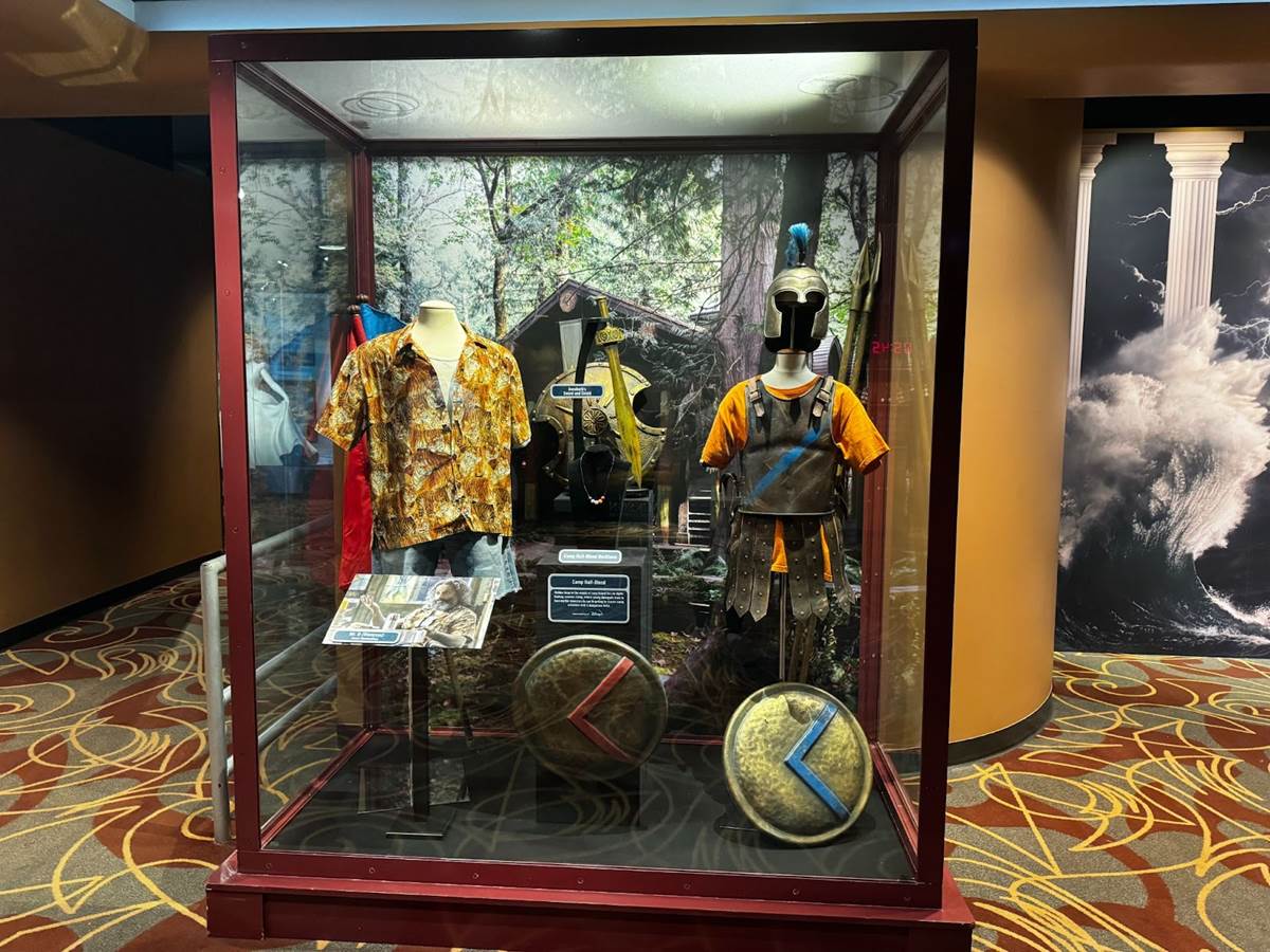 At the end of the exhibit is a lobby, a waiting area to the post-show theater. Glass display cases house costumes and props from the series, starting with costumes worn by Walker Scobell (Percy Jackson), Leah Sava Jeffries (Annabeth Chase), and Aryan Simhadri (Grover Underwood).