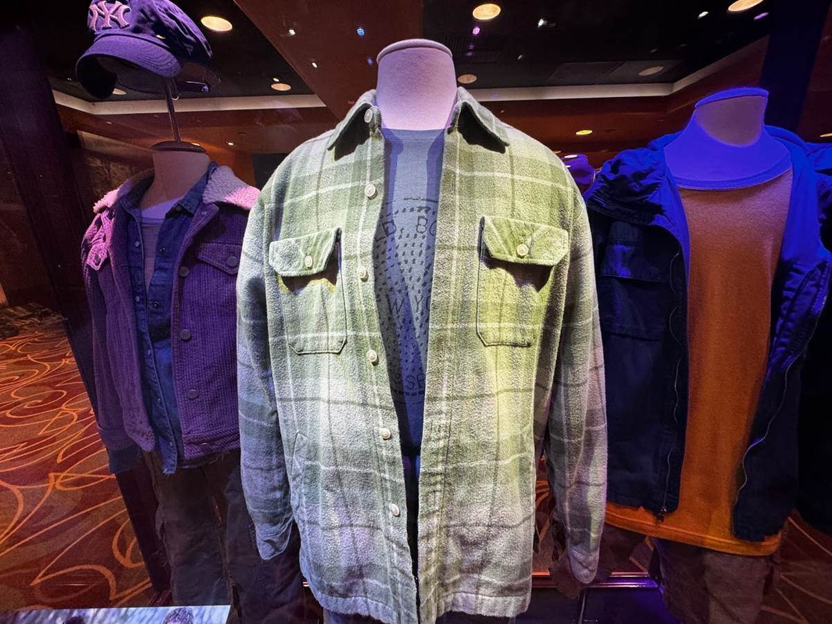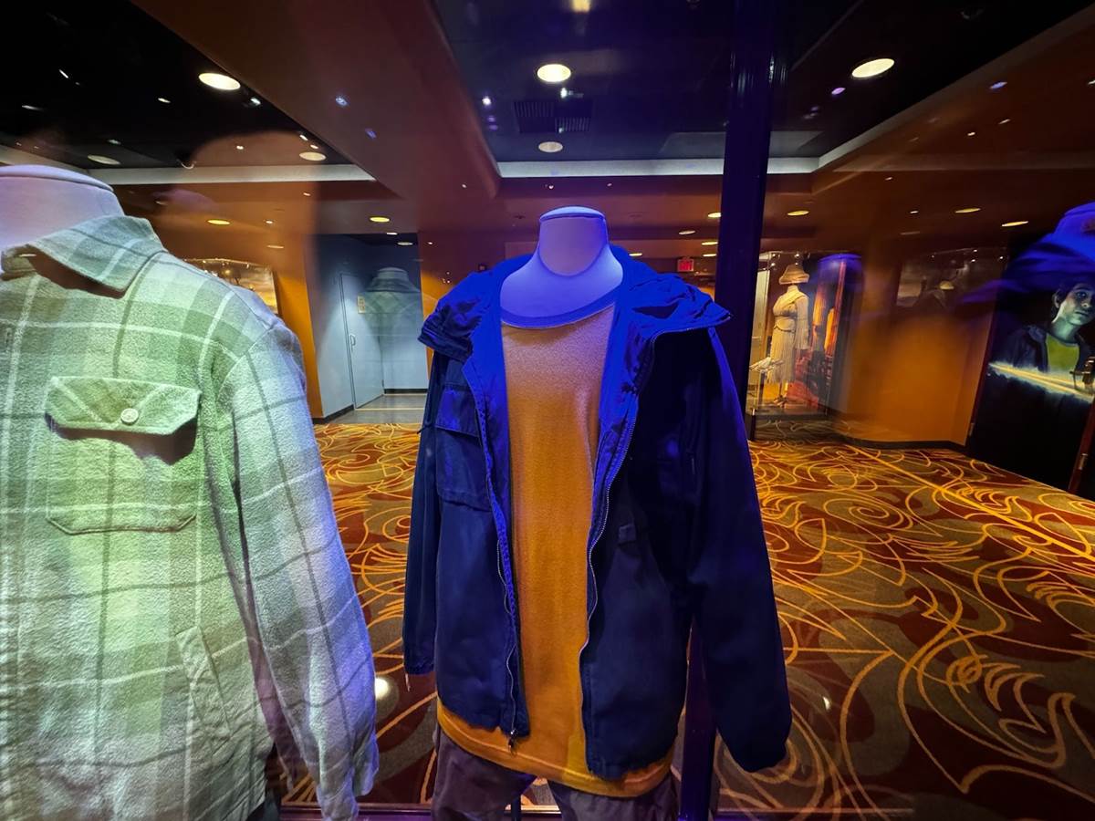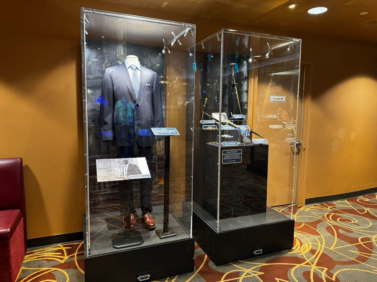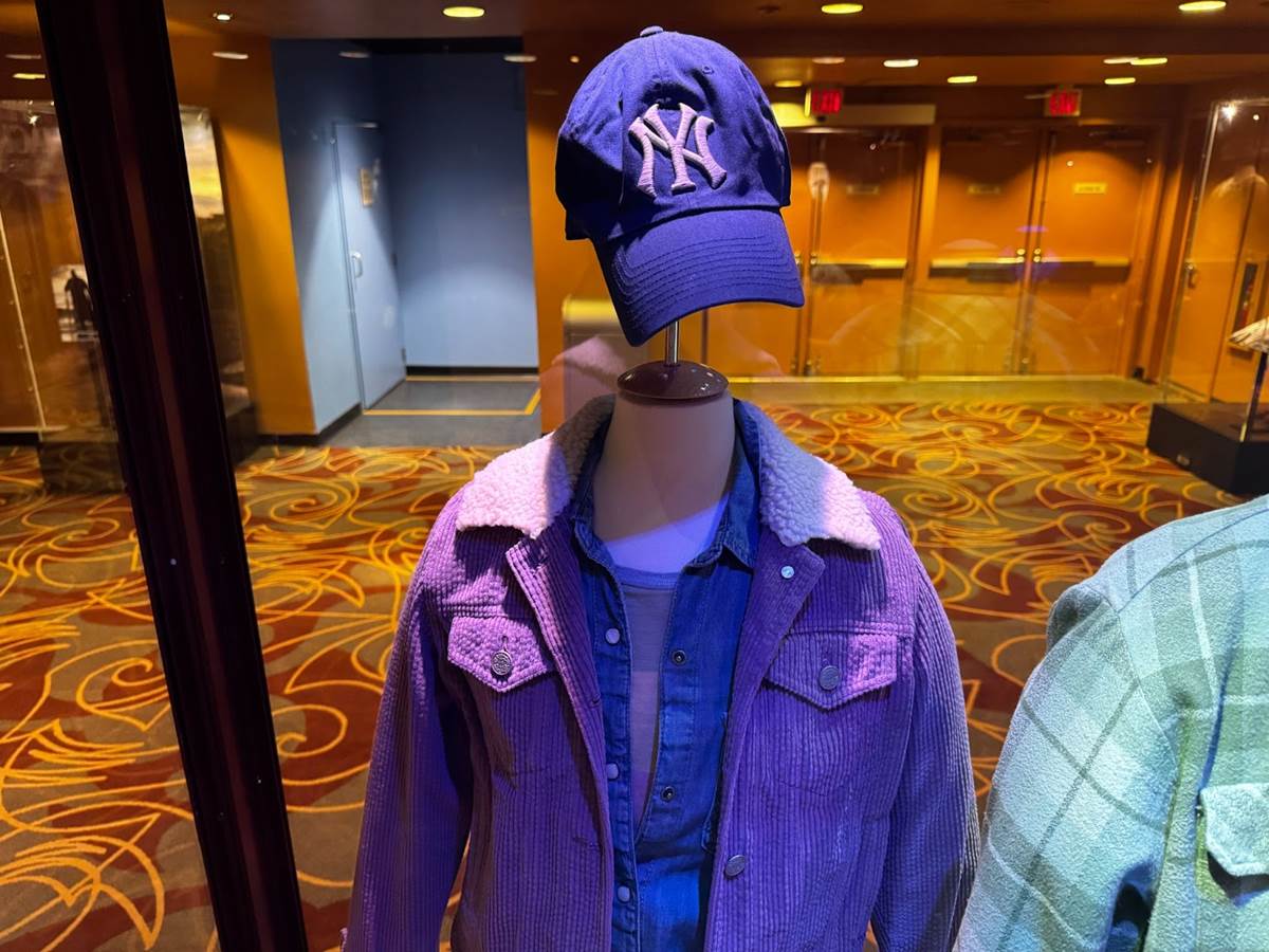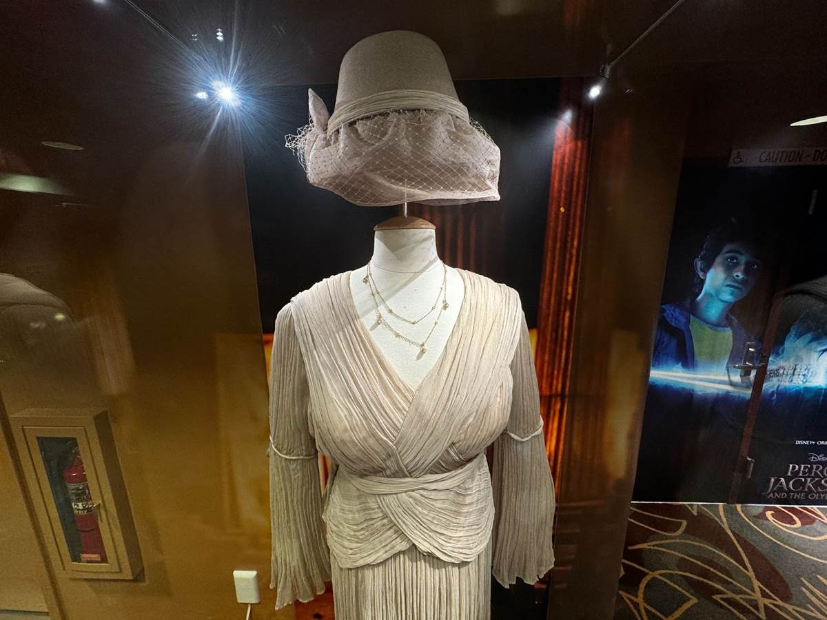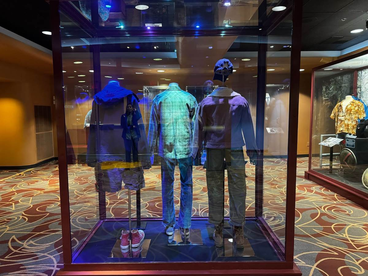 At the end of the exhibit is a lobby, a waiting area to the post-show theater. Glass display cases house costumes and props from the series, starting with costumes worn by Walker Scobell (Percy Jackson), Leah Sava Jeffries (Annabeth Chase), and Aryan Simhadri (Grover Underwood).