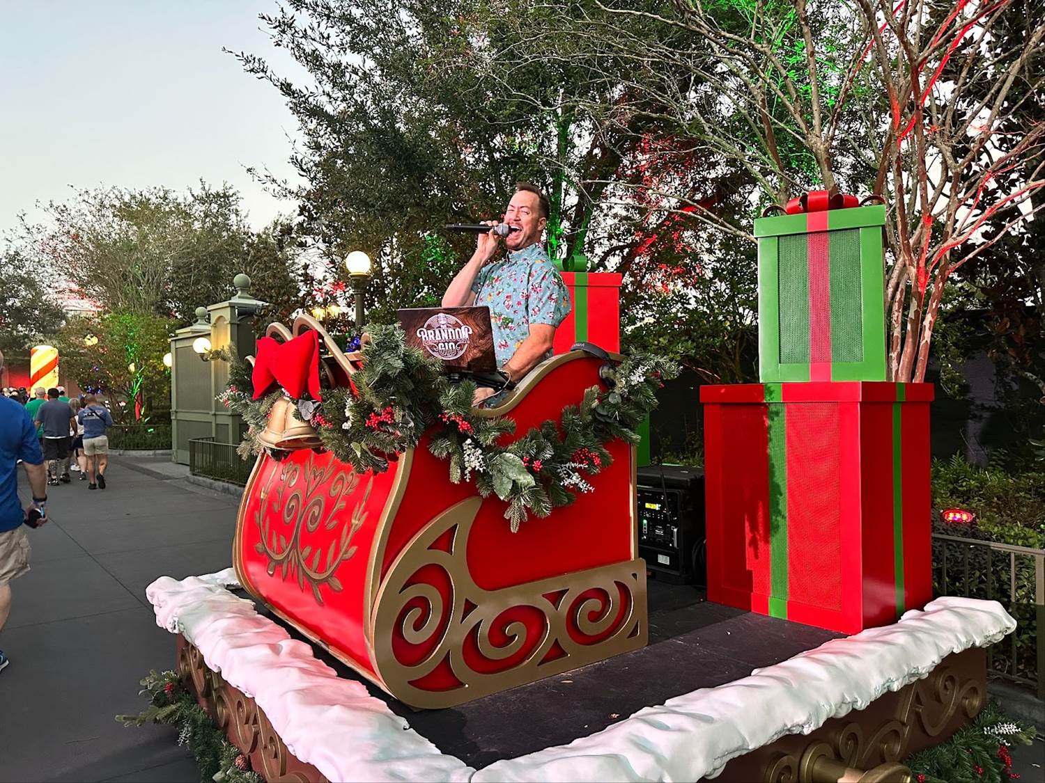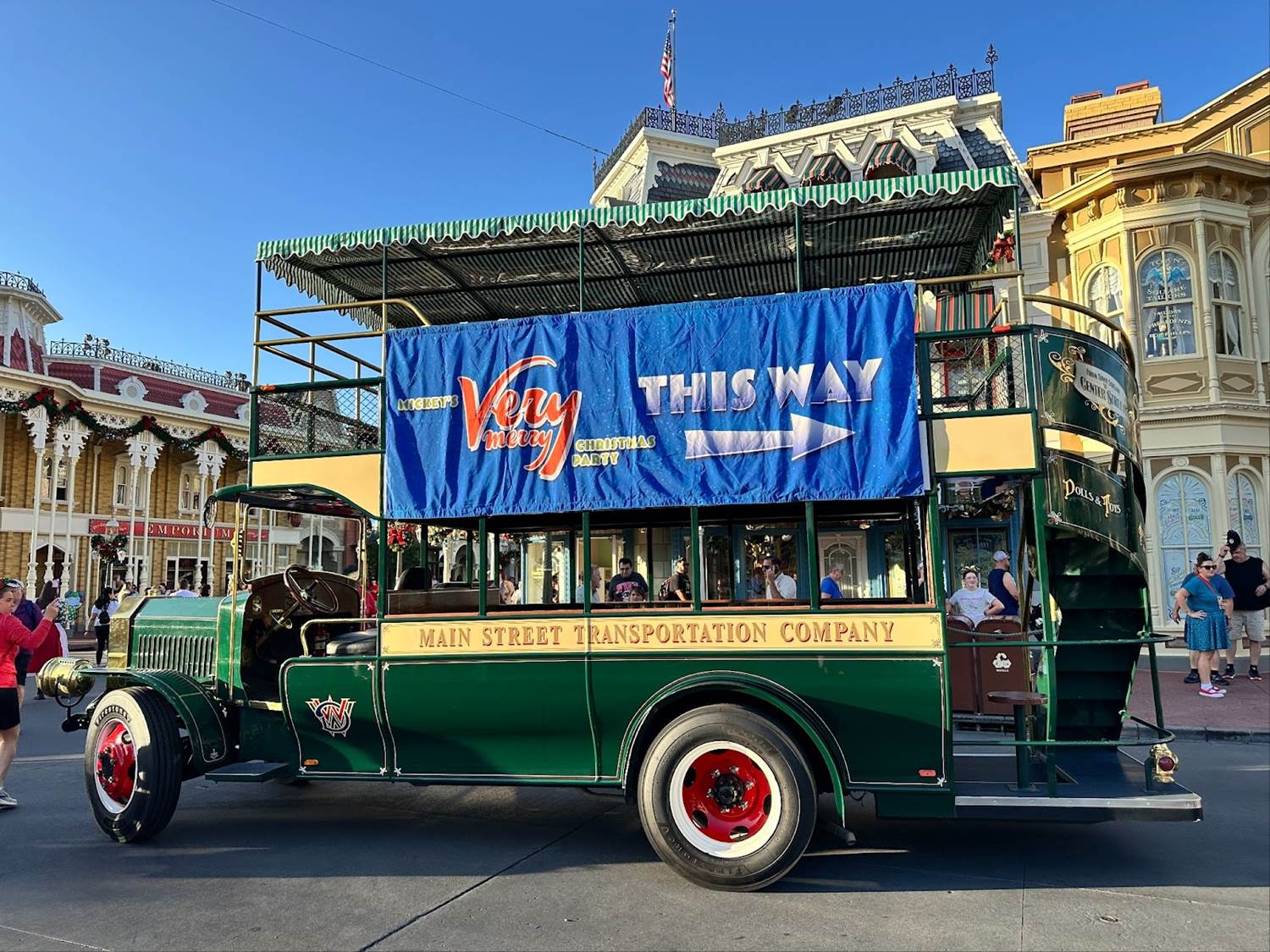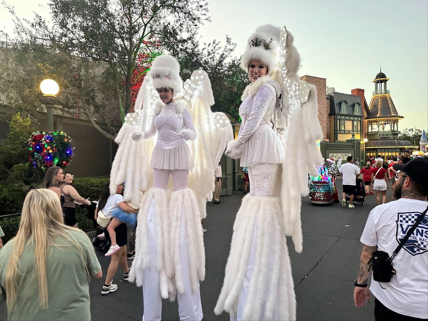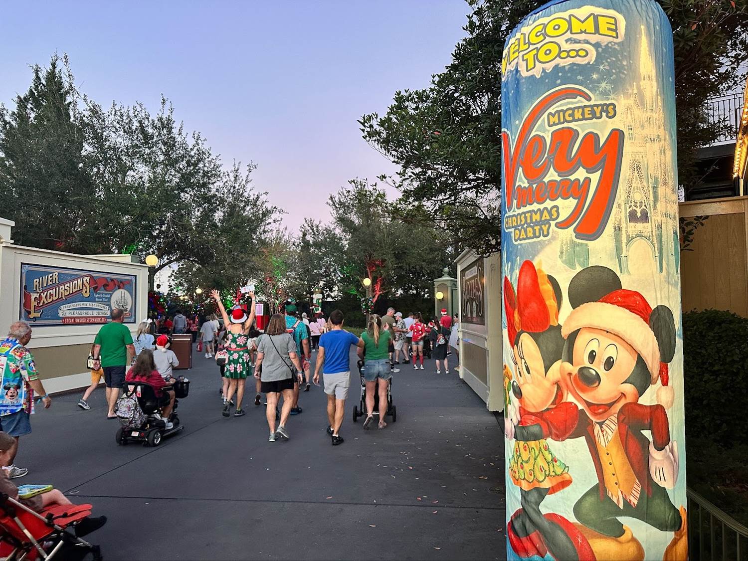 Mickey’s Very Merry Christmas Party has arrived just in time for the Holidays at Disney World. Magic Kingdom’s seasonal special event invites guests to celebrate the holidays with meet and greets, ride overlays, hot cocoa, and special entertainment opportunities! Guests entering the event are sent to the Main Street, U.S.A passthrough to pick up event credentials. Festive decorations, a holiday DJ, and snowflake stilt walkers welcome attendees to the holiday event. The passthrough also has Christmas-themed posters for different Magic Kingdom lands.