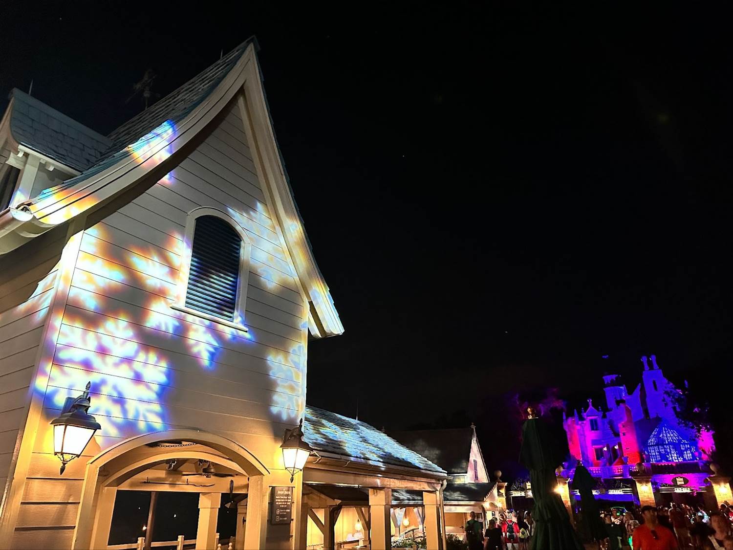 A Christmas party wouldn’t be complete with holiday lights! Throughout the park, special lighting and projections deck the halls of Magic Kingdom.