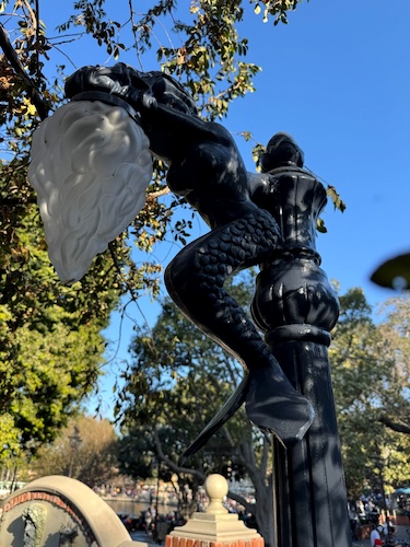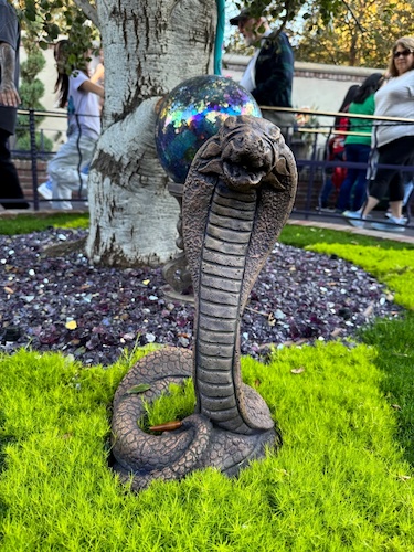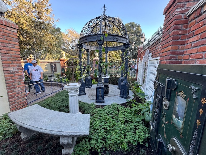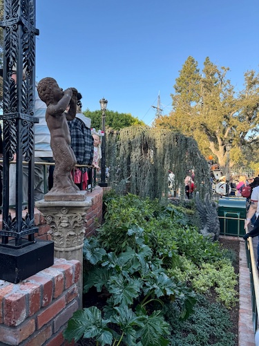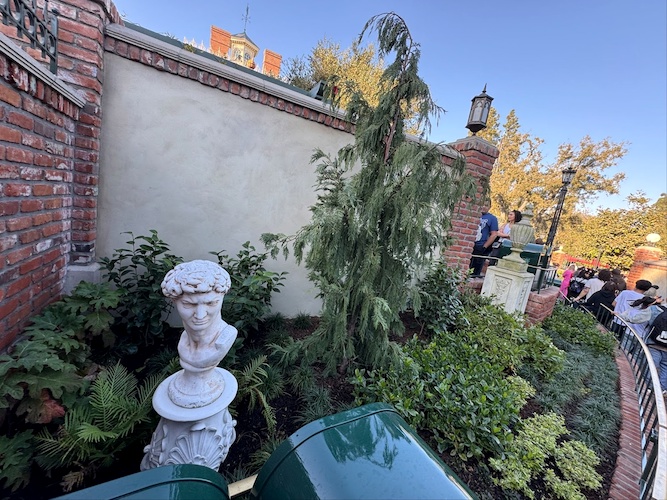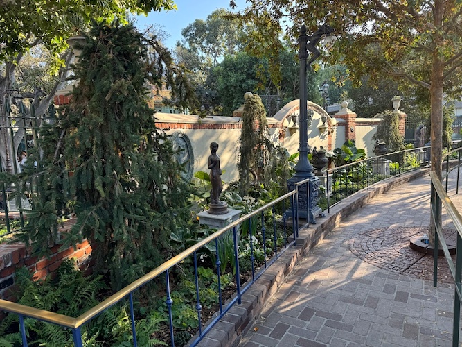 The new queue, which extends partially into the area of the plaza, brings references to the Disneyland classic outside the confinement of the ride’s facade. The new garden queue brings a quaint and luxurious atmosphere to the formerly cramped layout. In addition to the exciting decor, the Haunted Mansion now has permanent queue music. While Haunted Mansion Holiday has always played the Phantom Manor area music during the seasonal overlay, the classic version of the attraction comes fitted with audio and visual ambience.