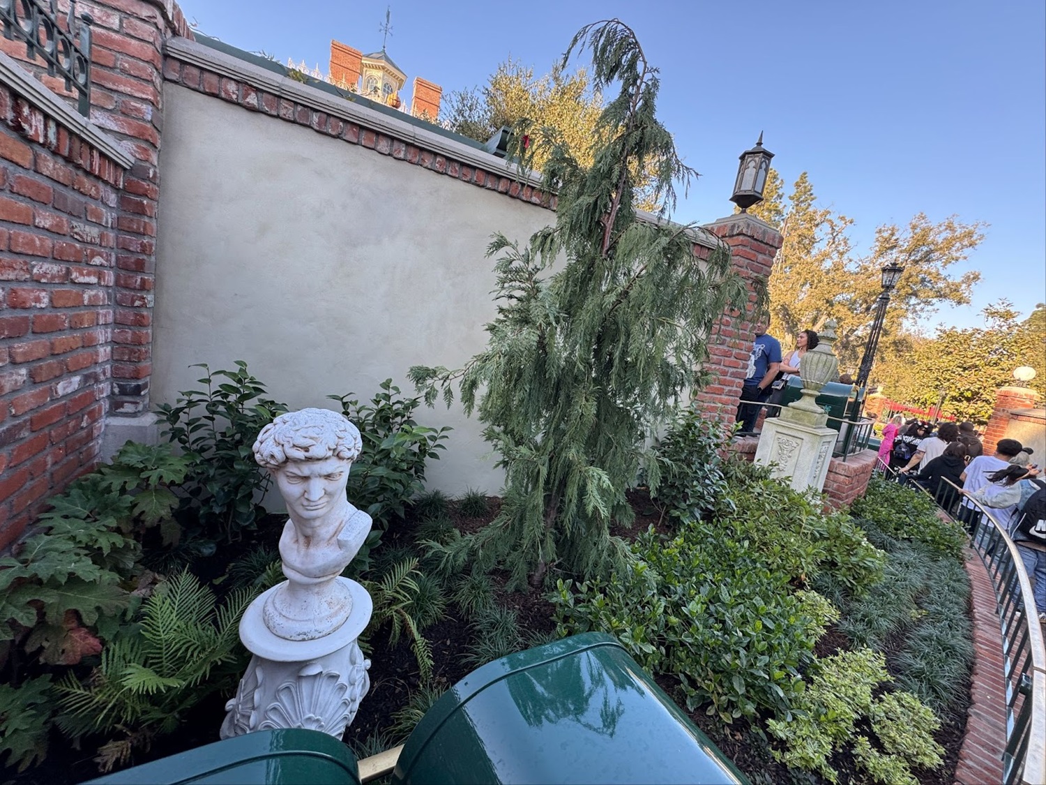 The new queue, which extends partially into the area of the plaza, brings references to the Disneyland classic outside the confinement of the ride’s facade. The new garden queue brings a quaint and luxurious atmosphere to the formerly cramped layout. In addition to the exciting decor, the Haunted Mansion now has permanent queue music. While Haunted Mansion Holiday has always played the Phantom Manor area music during the seasonal overlay, the classic version of the attraction comes fitted with audio and visual ambience.