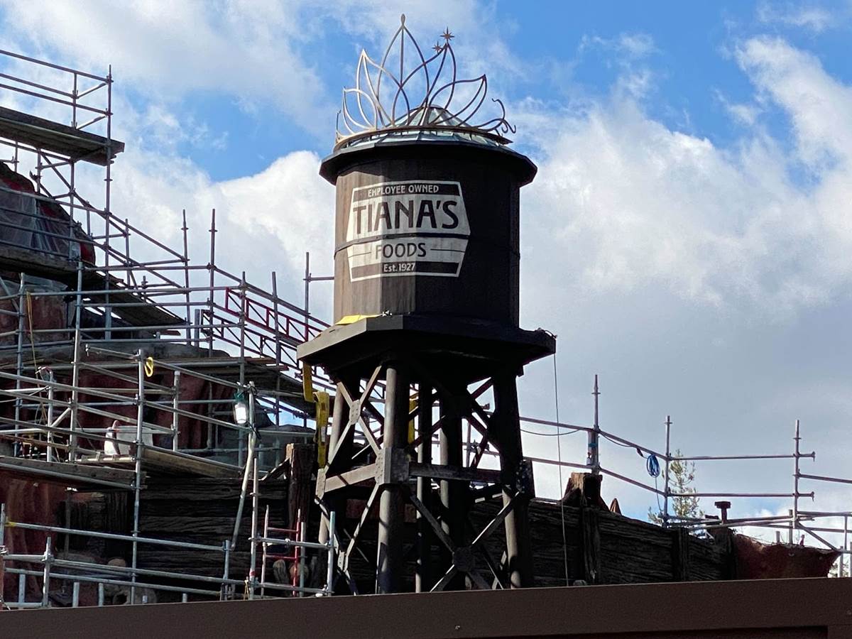We stopped by Disneyland today for a look at the ongoing construction on Tiana’s Bayou Adventure, including the addition of the Tiana’s Foods water tower.