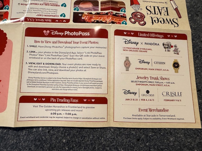 For those looking to pick up merchandise to commemorate their trip to Sweethearts’ Nite, head over to Starcade in Tomorrowland to explore a selection of exclusive merchandise celebrating the season of love. Event wristbands are required to enter the popup store.