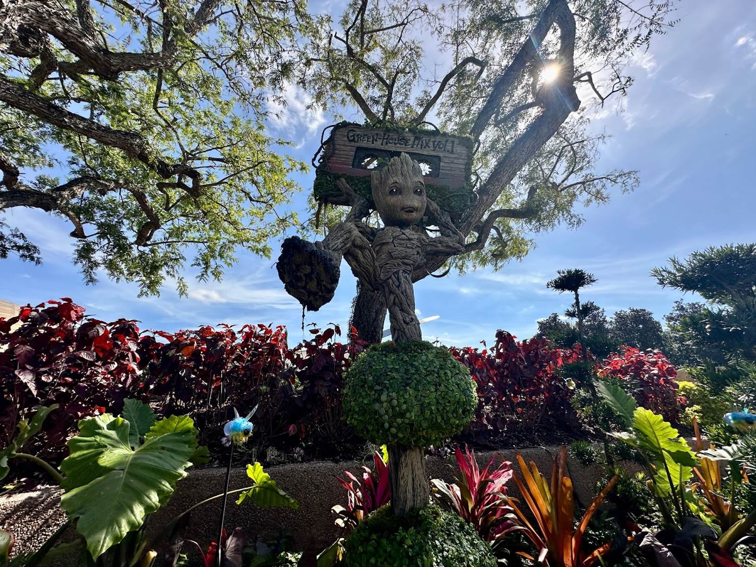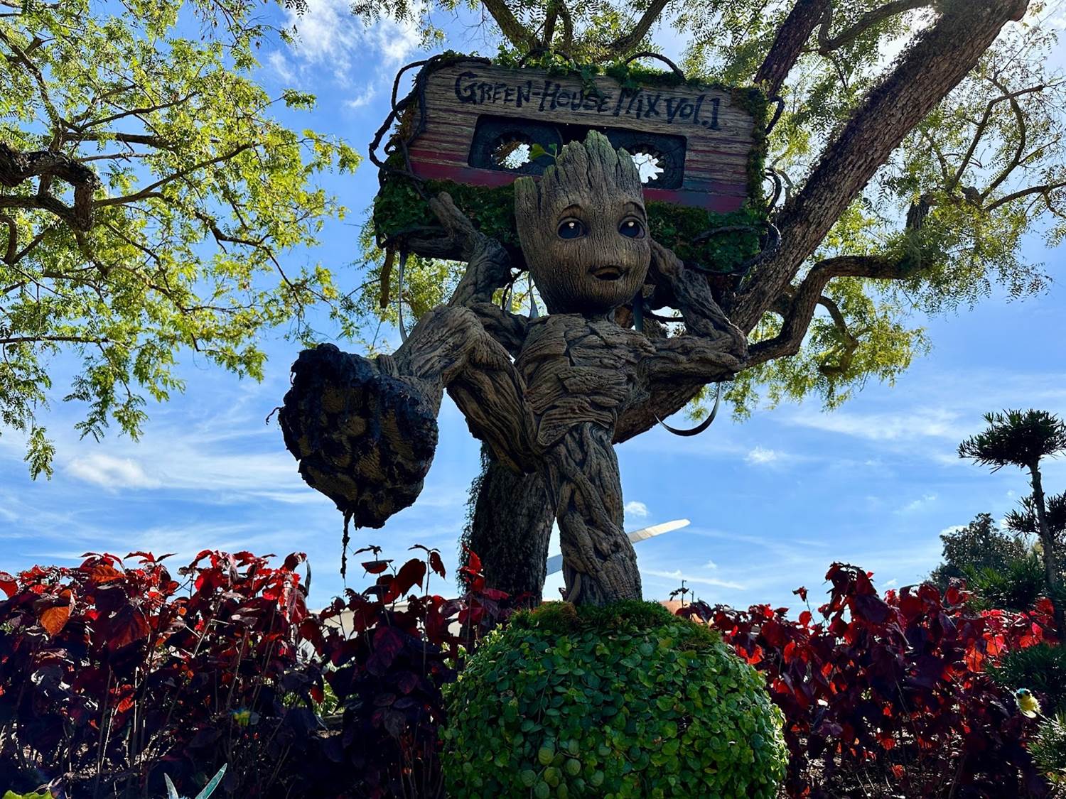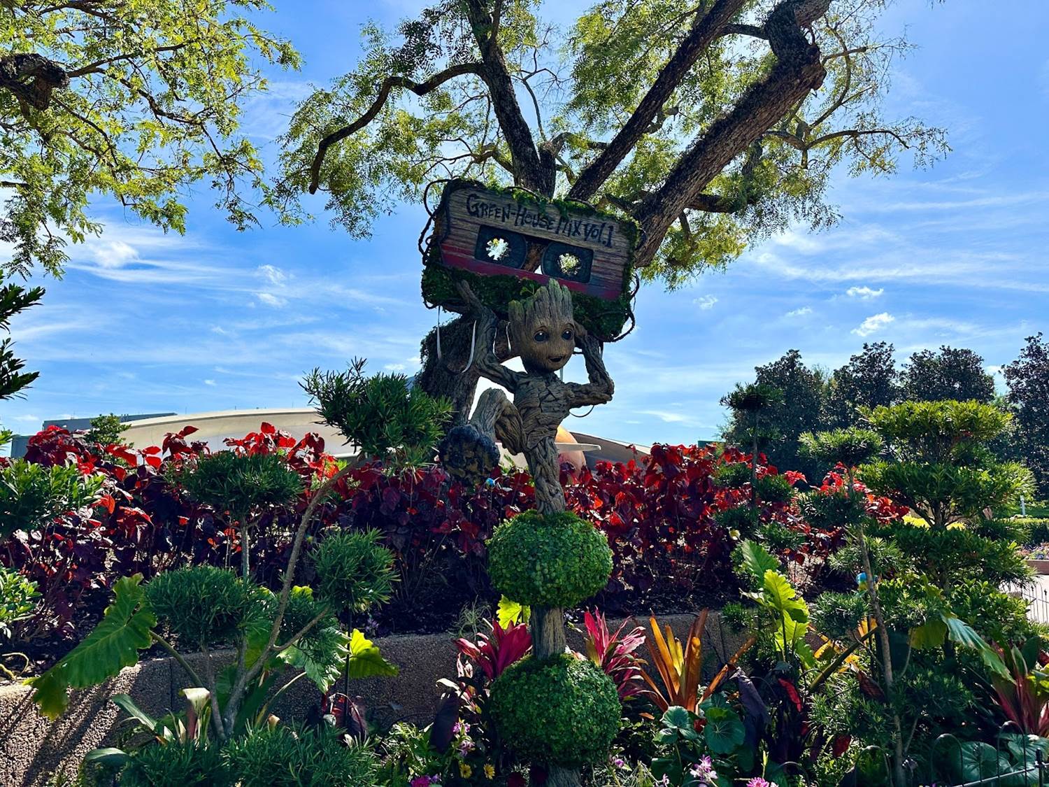 Over by Guardians of the Galaxy: Cosmic Rewind, this new topiary features Groot holding up the “Green-House Mix Vol. 1."