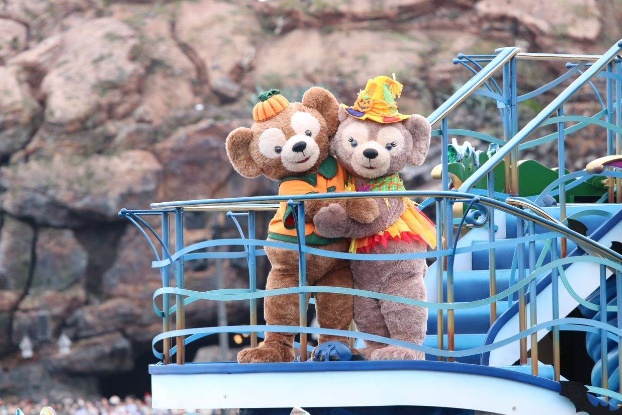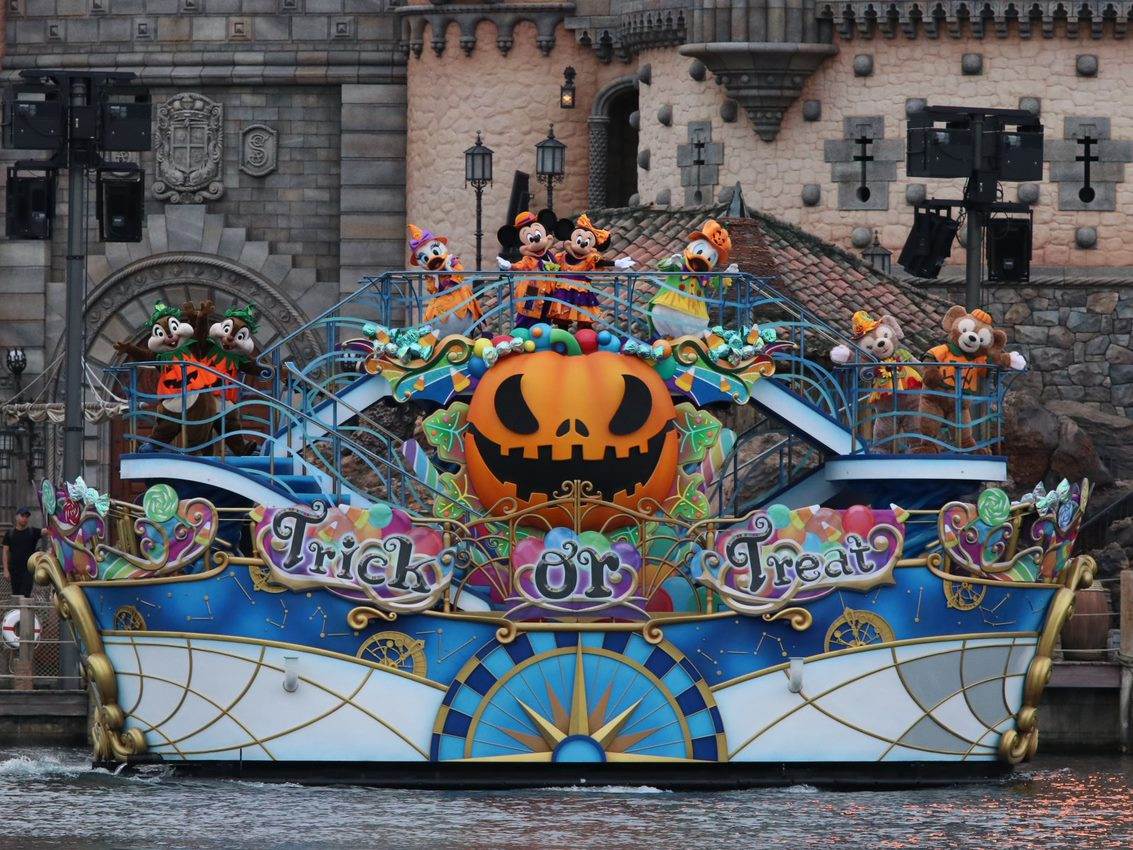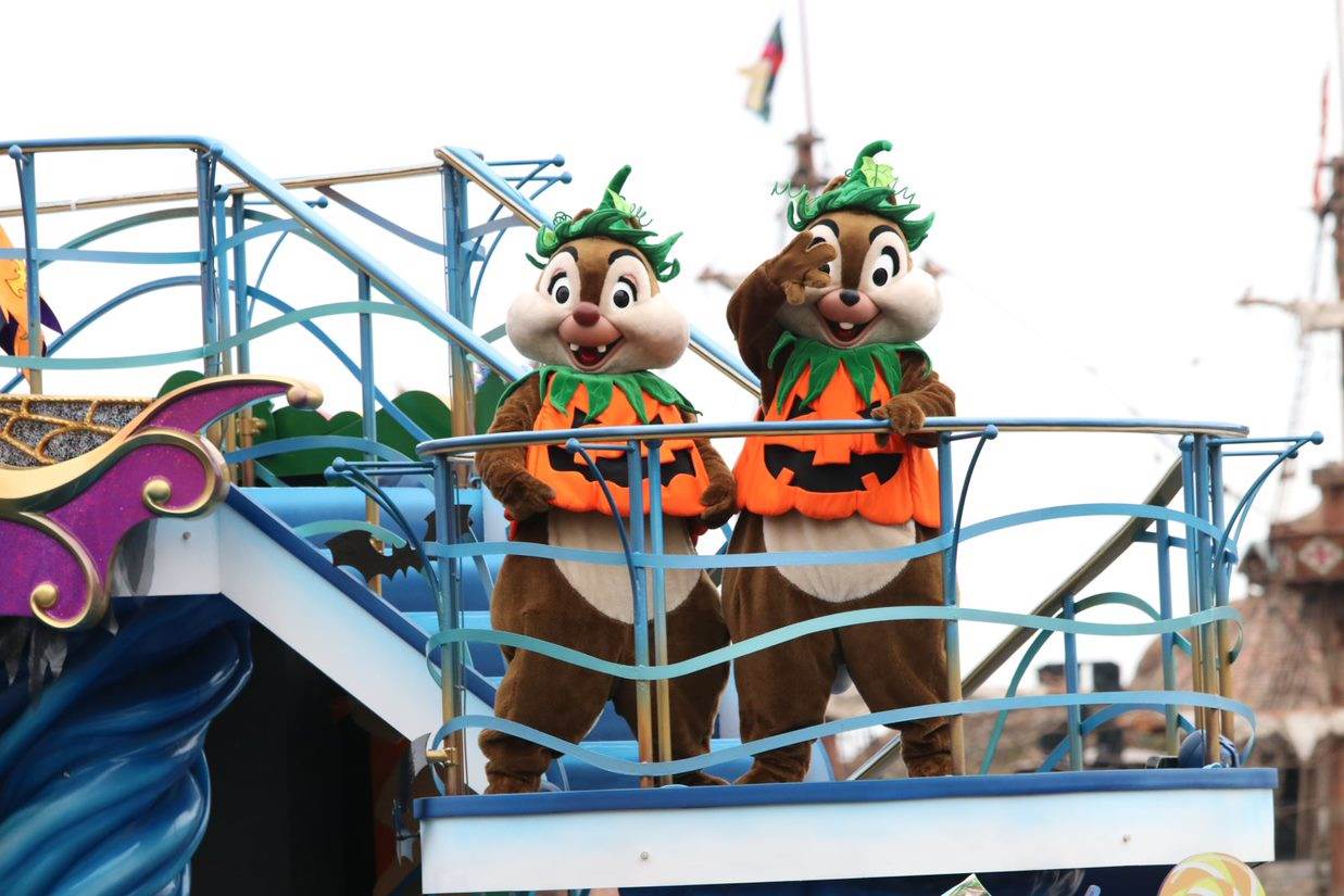 Guests visiting Tokyo DisneySea have plenty of opportunities to join in on the Halloween fun! The Mediterranean Harbor area hosts the Disney Halloween Greeting. The special water parade welcomes guests into the park with Mickey, Donald, Minnie, Daisy, Chip, Dale, Duffy, and Shelly Mae adorned with jack-o-lantern themed costumes.