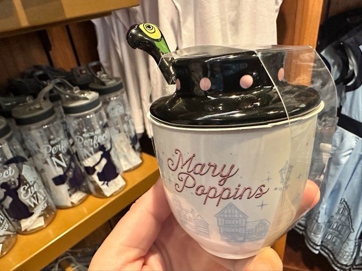 Looking for a cup of tea? Make sure you grab the Marry Poppins mug, which features a cover shaped like the nanny’s whimsical hat and a spoon inspired by her magical umbrella.