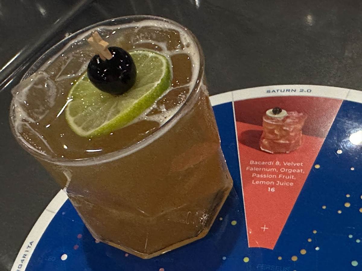 - Bacardi 8, Velvet Falernum, Orgeat, passion fruit, lemon juice
