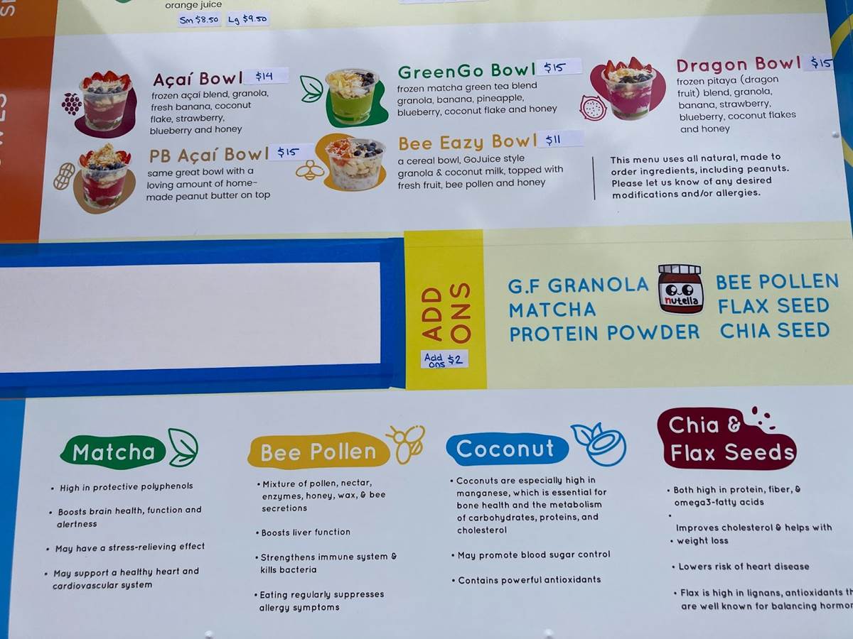 - Guests can enjoy everything from the Pink Drink Refresher - dragon fruit and honey - to the Green Machine Smoothie - pineapple, banana, mint, spinach, Florida fresh orange juice - to the classic Acai Bowl - frozen acai blend, granola, fresh banana, coconut flake, strawberry, blueberry and honey.