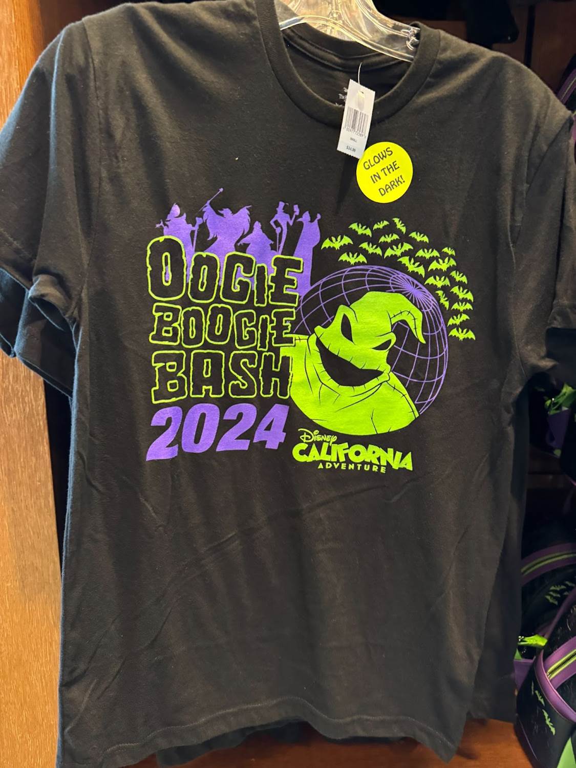 For those hotter event nights, a cool t-shirt features glow-in-the-dark green elements, including Oogie Boogie and his bats.