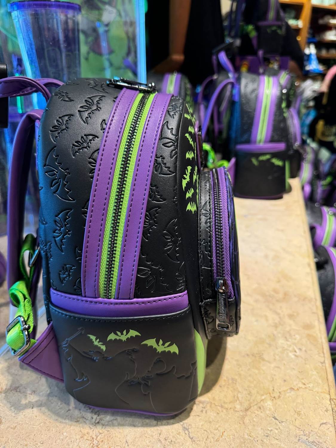 One of the most sought-after items this year will undoubtedly be the event-exclusive Oogie Boogie Loungefly mini backpack. Oogie Boogie appears front and center on a circular zippered compartment, evocative of his shadow on the moon at night. With the boogie man’s bats flying all over Disney California Adventure Park during HalloweenTime, the bat motif adds another fun element to the bag.
