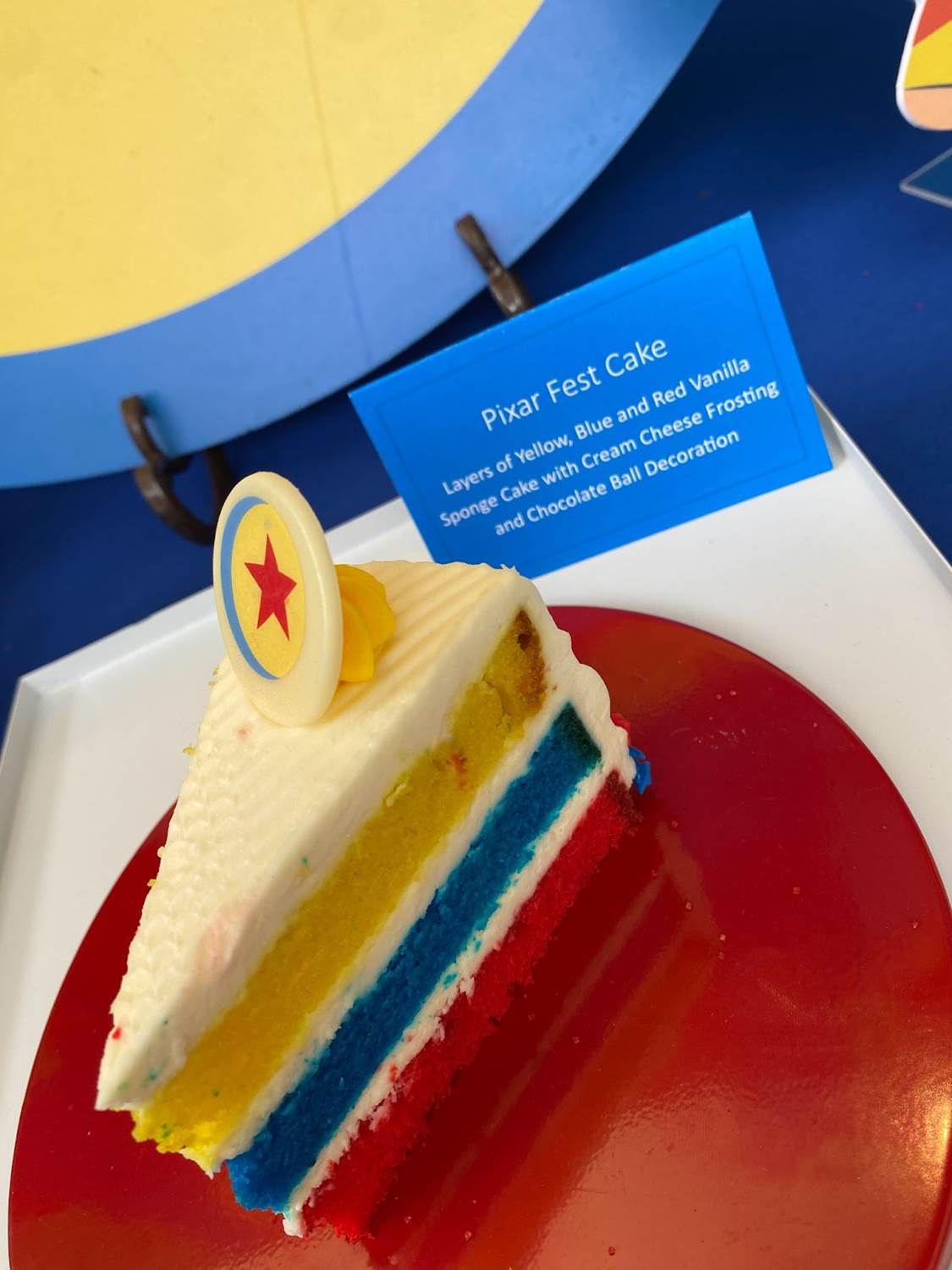 A returning favorite is the Pixar Fest Cake at Plaza Inn. It features layers of yellow, blue, and red vanilla sponge cake with cream cheese frosting and chocolate Pixar Ball decoration