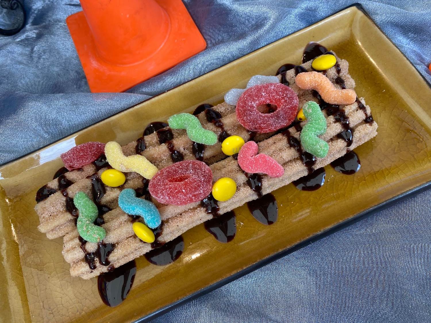 Get your treats on Route 66, like the Junkyard Jamboree Churro, available at Cozy Cone Motel 1. It features a chocolate-espresso sugar-dusted churro with chocolate engine oil sauce topped with assorted candy parts