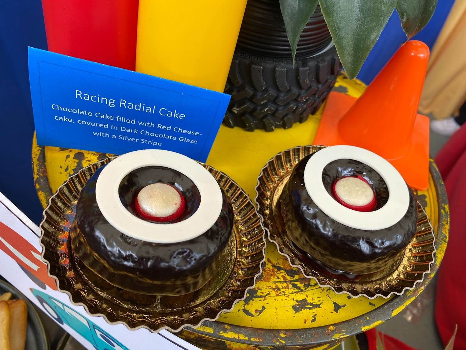 For dessert, Flo’s has the Racing Radial Cake - chocolate cake filled with red cheesecake covered in a dark chocolate glaze with a silver stripe.