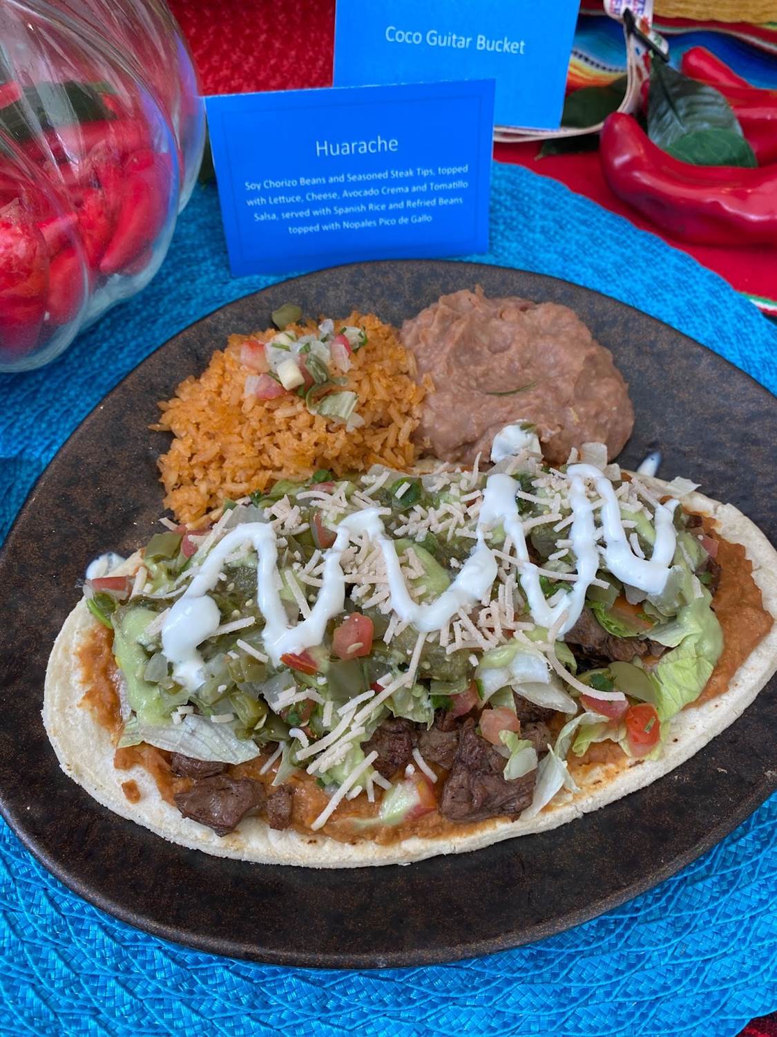 Paradise Garden Grill becomes “Recuerdame at Paradise Garden Grill" for Pixar Fest, and their signature menu items is Huarache (soy chorizo beans and seasoned steak tips topped with lettuce, cheese, avocado crema, and tomatillo salsa and served with Spanish rice and refried beans topped with nopales pico de gallo).