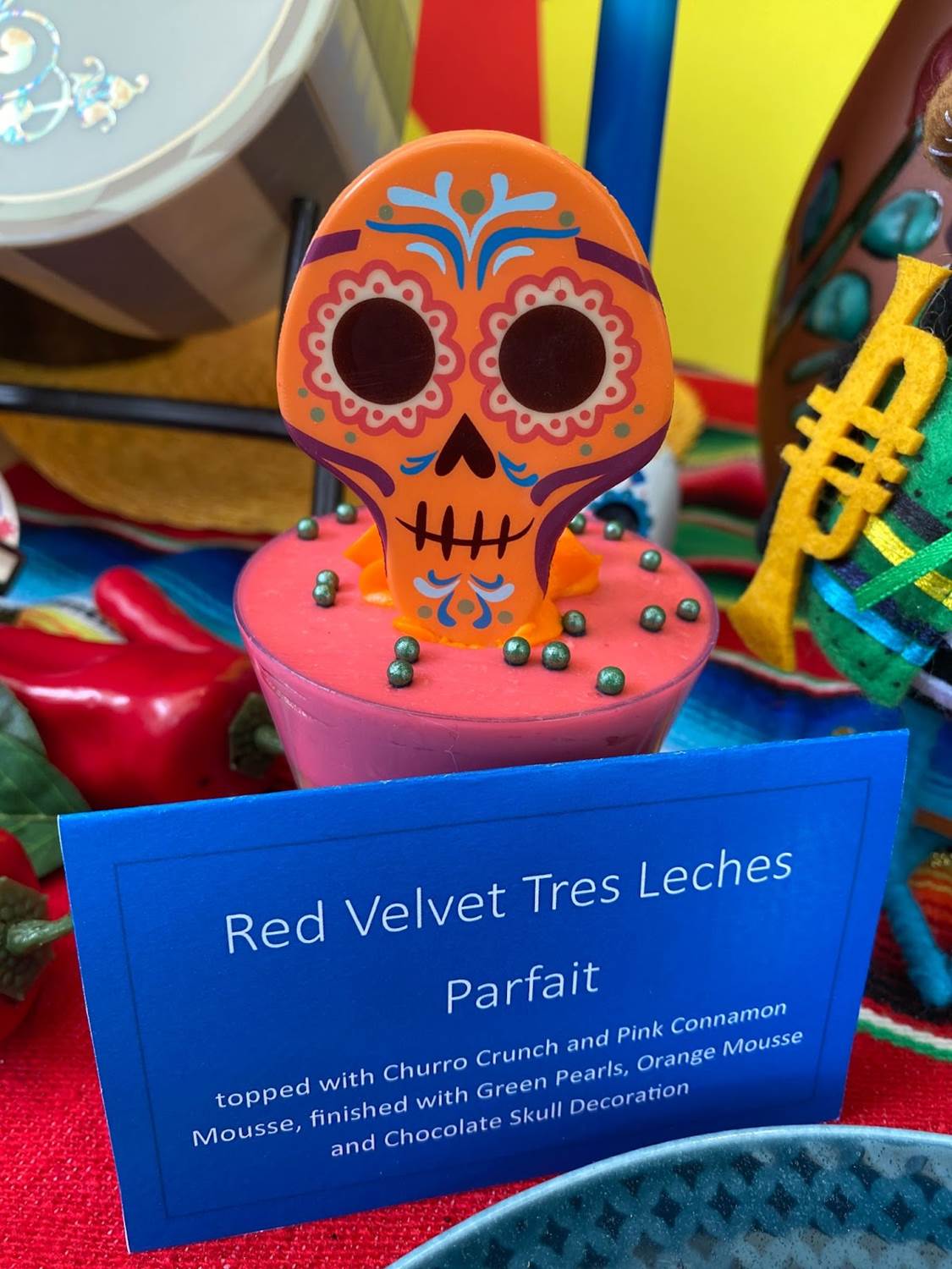 Don’t skip dessert, which is a Red Velvet Tres Leches Parfait (topped with churro crunch and pink cinnamon mousse, finished with green pearls, orange mousse, and chocolate skull decoration).
