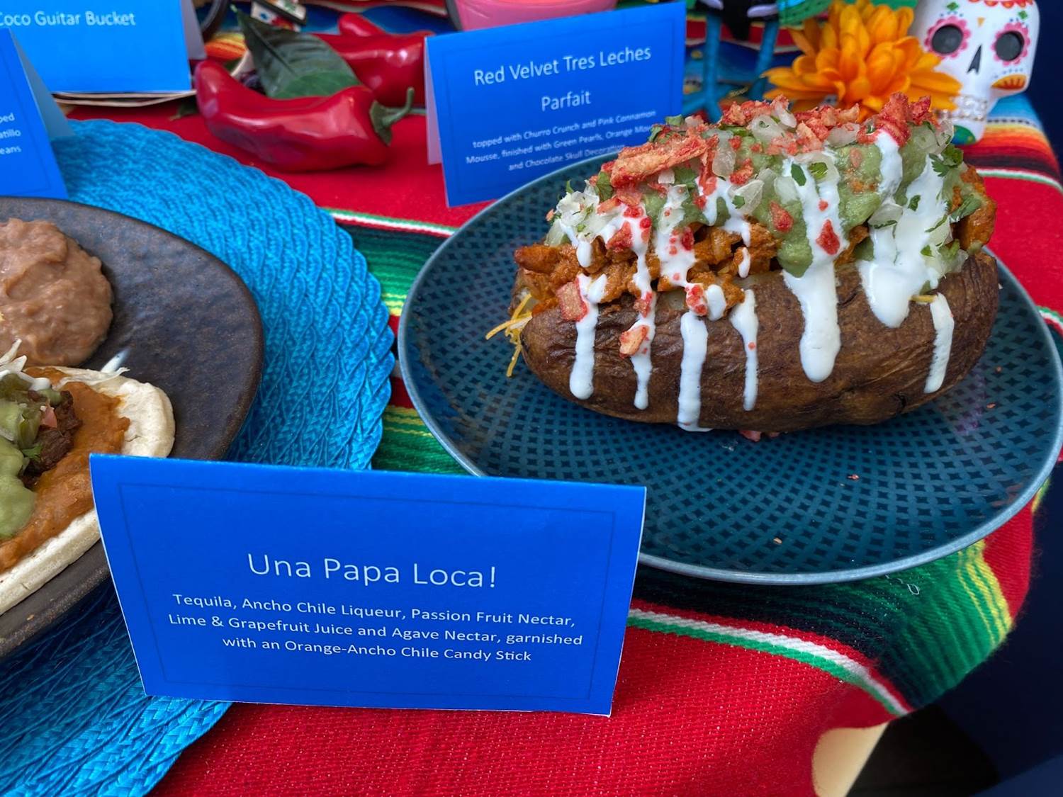 Troubadour Tavern has Una Papa Loca! (chicken al pastor, cheese, avocado salsa, and sour cream topped with onion and cilantro with spiced corn chip crumble).