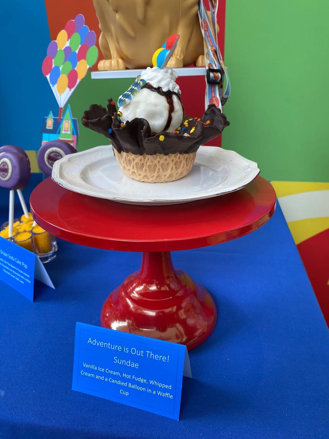Anyone can enjoy the Adventure is Out There! Sundae, available at Clarabelle’s Hand-Scooped Ice Cream. It comes with vanilla ice cream, hot fudge, whipped cream, and a candied balloon in a waffle cup.