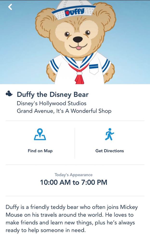 - According to the My Disney Experience app, he will be there today from 10:00 a.m. to 7:00 p.m.