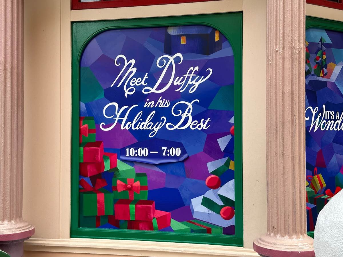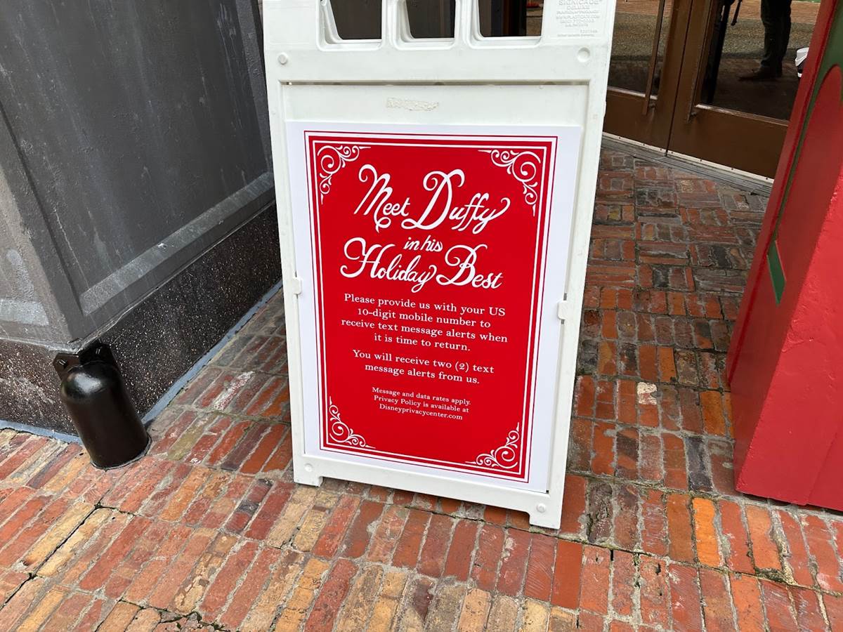- The sign out in front of It’s a Wonderful Shop says, “Meet Duffy in his Holiday Best. Please provide us with your US 10-digit mobile number to receive text message alerts when it is time to return. You will receive two (2) text message alerts from us. Message and data rates apply. Privacy Policy is available at DisneyPrivacyCenter.com."