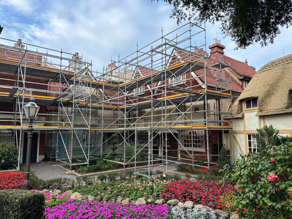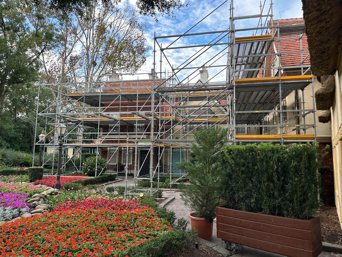 With refurbishment work wrapping up at EPCOT’s Canada pavilion, it’s the United Kingdom pavilion’s time to get a little sprucing up, with scaffolding now covering some of the buildings.