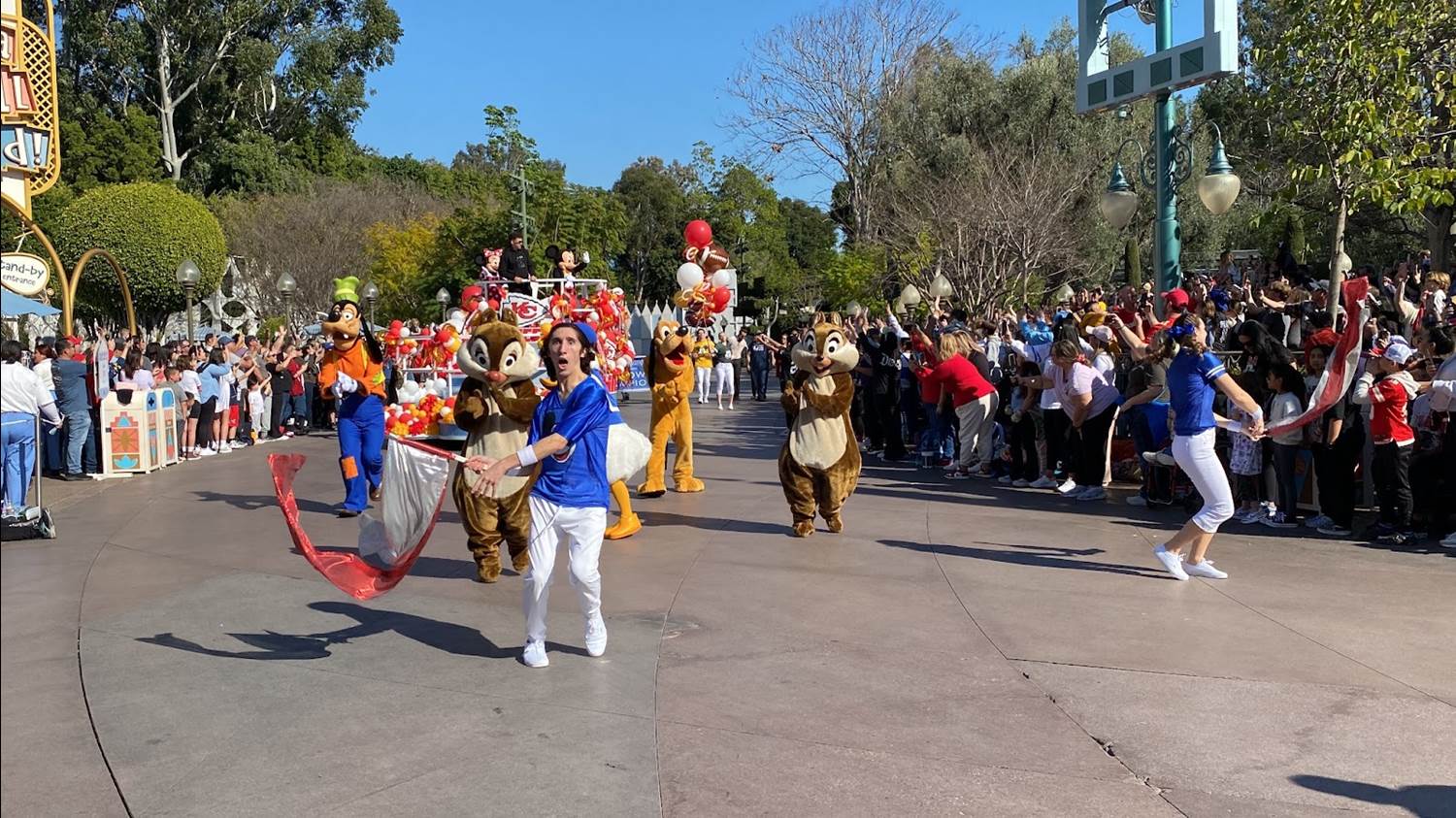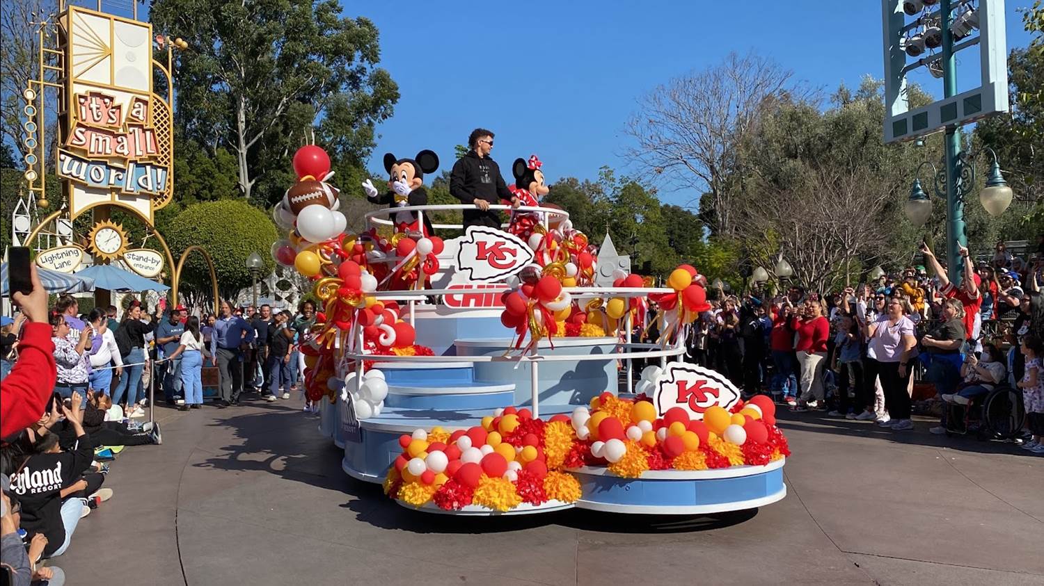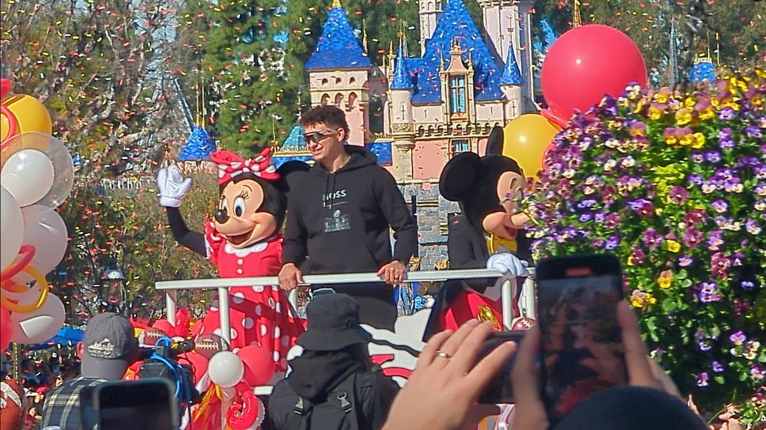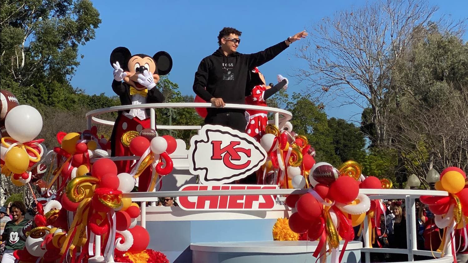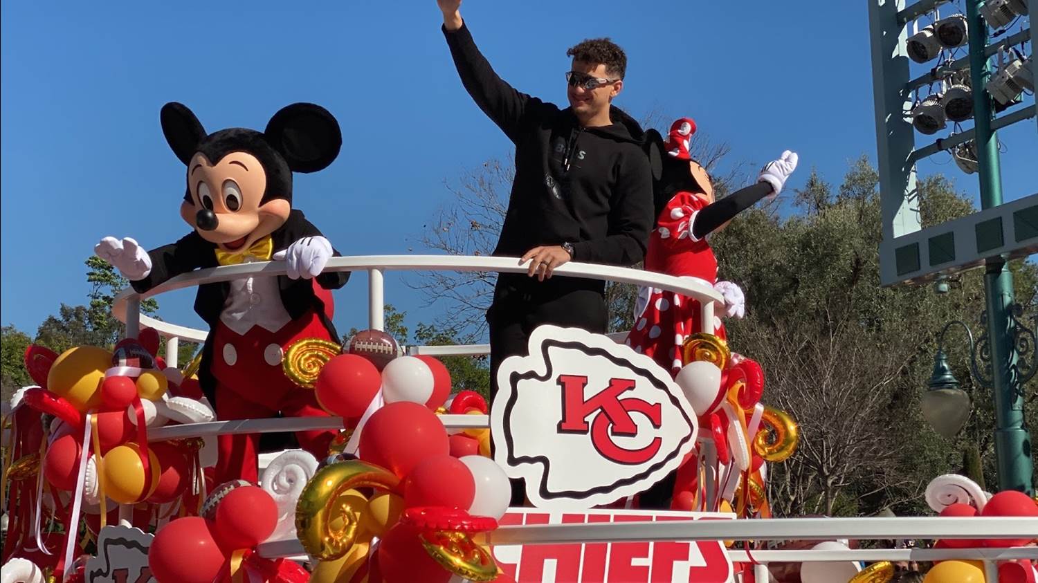 As with previous years, Patrick Mahomes appeared in a cavalcade full of Disney characters and dancers parading past “it’s a small world" and down Main Street U.S.A. at Disneyland Park.