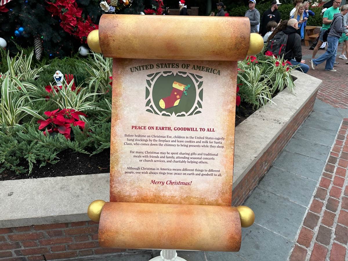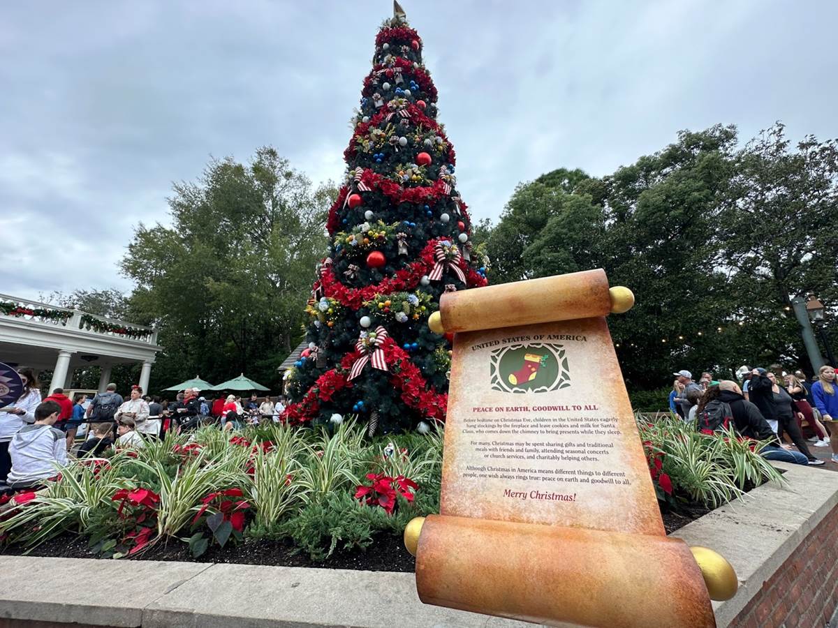 Our journey through the EPCOT International Festival of the Holidays brings us to The American Adventure, where decorations, special food, and the Voices of Liberty bring a festive flair.