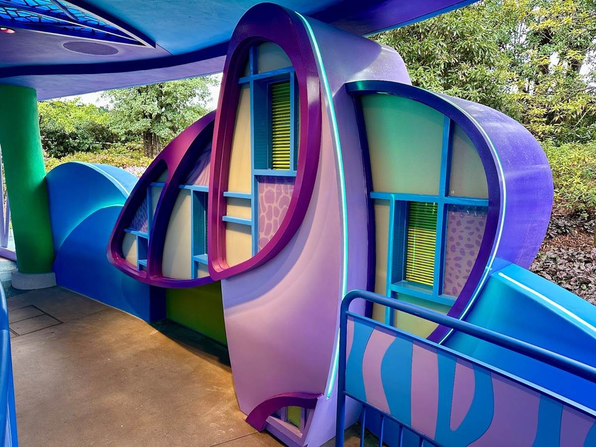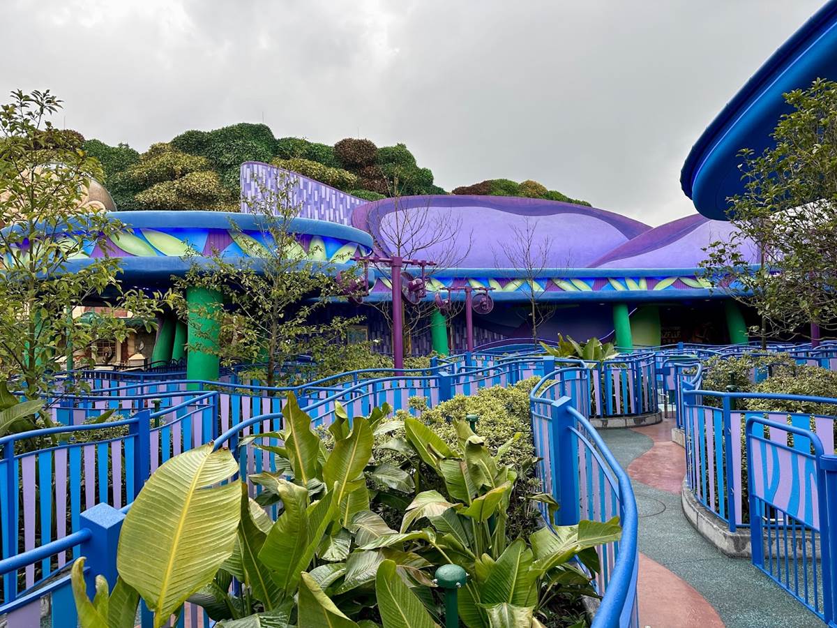 The first half of the queue takes place outside in this very colorful section of switchbacks.