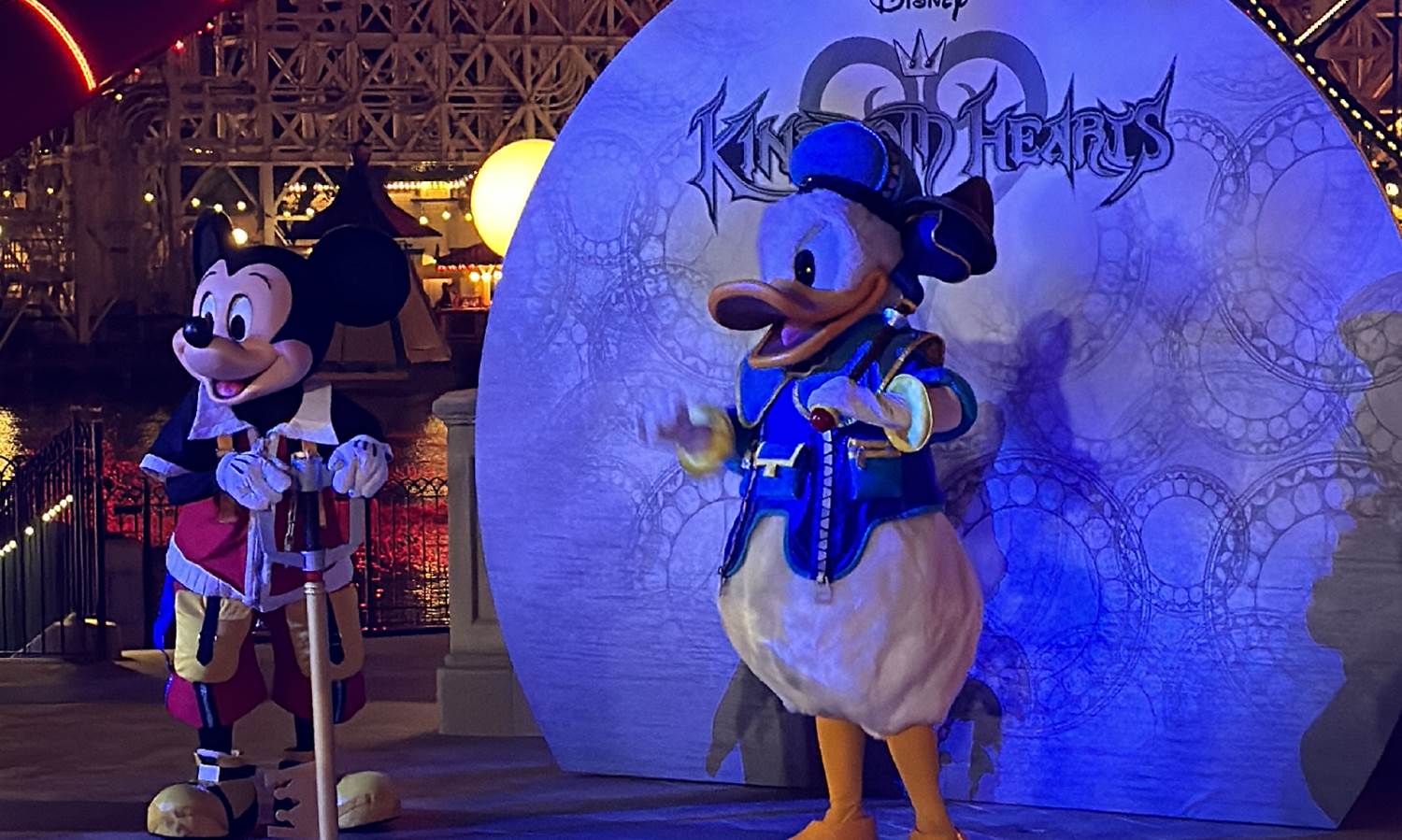 The one exception to the “no meet and greet" rule of thumb with the Oogie Boogie Bash treat trails is the World of Color Treat Trail. Within, Guests will find Mickey and Donald in their outfits from the Kingdom Hearts video game series, available for hugs and photos in front of a backdrop.