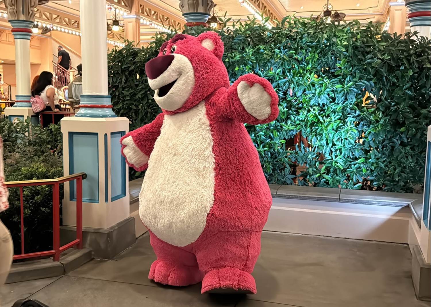 Lots of Pixar friends are hanging around Pixar Pier. Grab a strawberry-scented hug from Lotso, and also be on the lookout for Edna Mode and Frozone from The Incredibles, Ember and Wade from Elemental, and Joy from Inside Out.