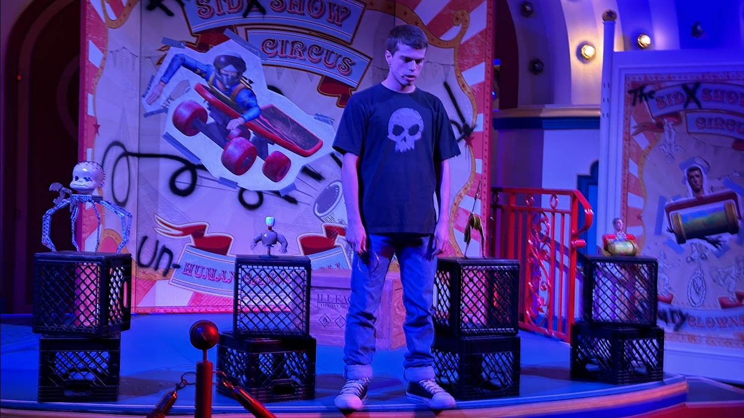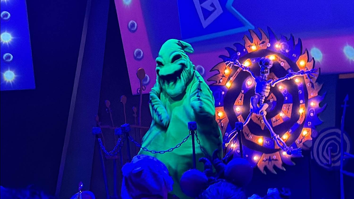 The night’s namesake, Oogie Boogie himself, has taken up residence in Animation Academy, turning it into his own blacklight lair. As you collect your treats, he spins his wheel of tricks.