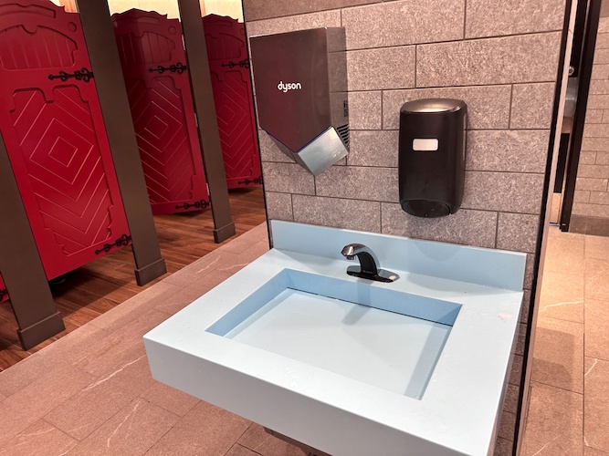 - The interior has been updated and modernized from its previous, rather plain self. Guests will find all the modern amenities of new Disney restrooms, including large sinks and Dyson Airblade hand dryers.