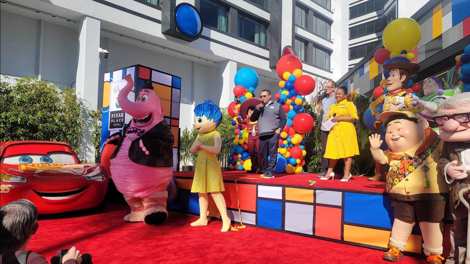 Disneyland Resort Ambassador Jada Young hosted the ceremony, which she kicked off by thanking Lightning McQueen and Tow Mater for making it there “all the way from Radiator Springs." Then she continued by saying, “We are thrilled to be celebrating our love for all things Pixar, and we are so honored and excited to have you all here today." Then Ken Potrock took the stage, saying “I wanted to welcome all of you that are here today to help us mark an incredible milestone that has been years in the making– the first completely dedicated Pixar-themed hotel here in the United States. I [also want to] make sure that I’m thanking all the people that put enormous hard work, creativity, perseverance, and commitment into this project." Potrock then specifically called out three different groups: Walt Disney Imagineering, Pixar Animation Studios, and the Cast Members of the Disneyland Resort, but especially those working at the Pixar Place Hotel: “They are extraordinary. They are so excited. They are true storytellers in their own right, taking our guests through all of the wonderful things that are happening in this hotel."