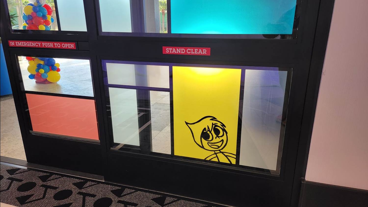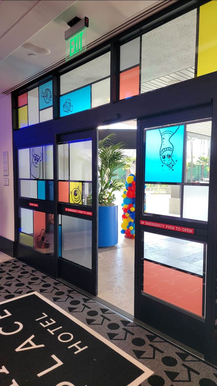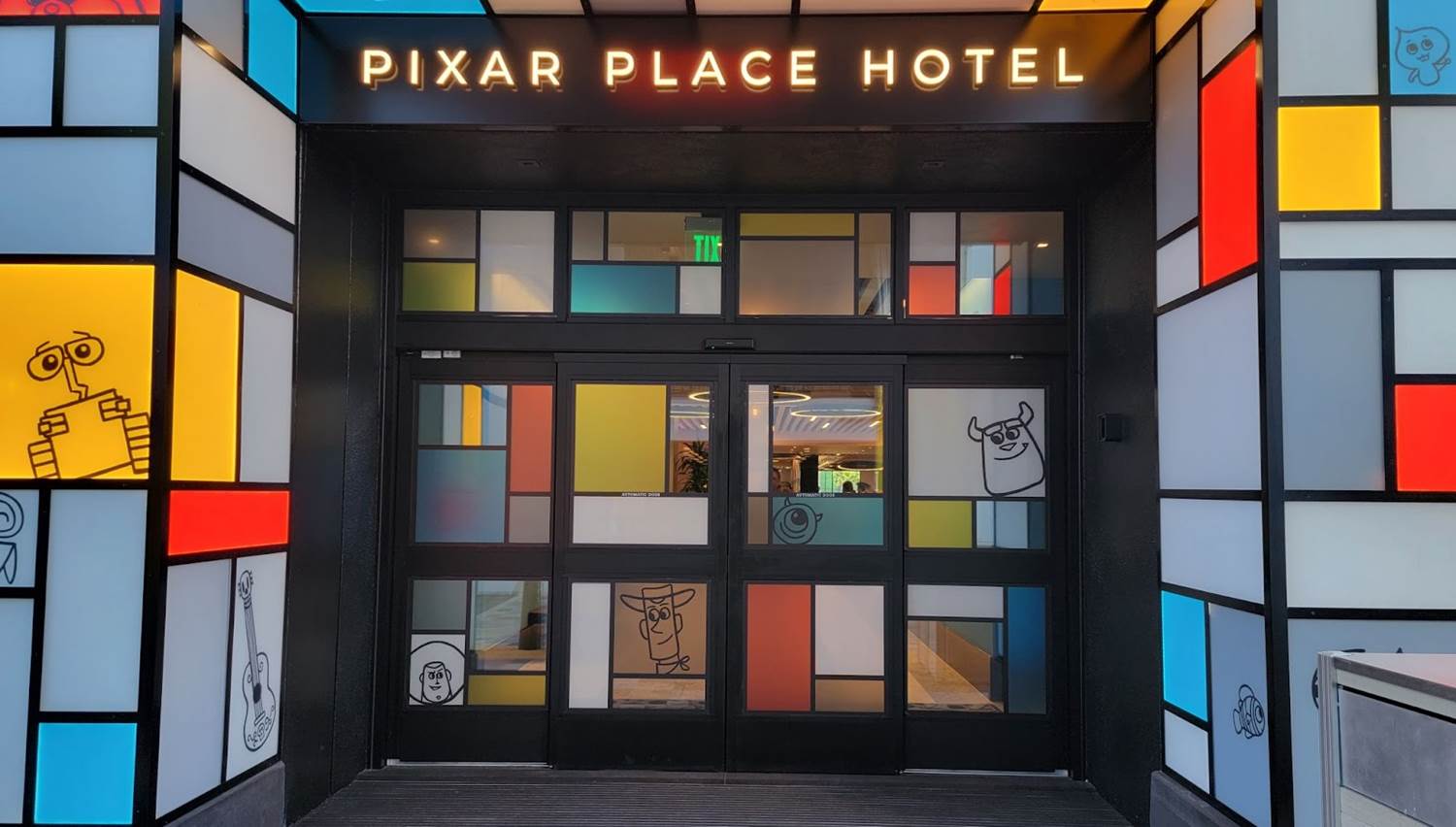 Guests are welcomed into the Pixar Place Hotel through a colorful entrance adorned with sketches of some of their favorite Pixar characters, like Wall-E, Buzz Lightyear, Nemo and more.