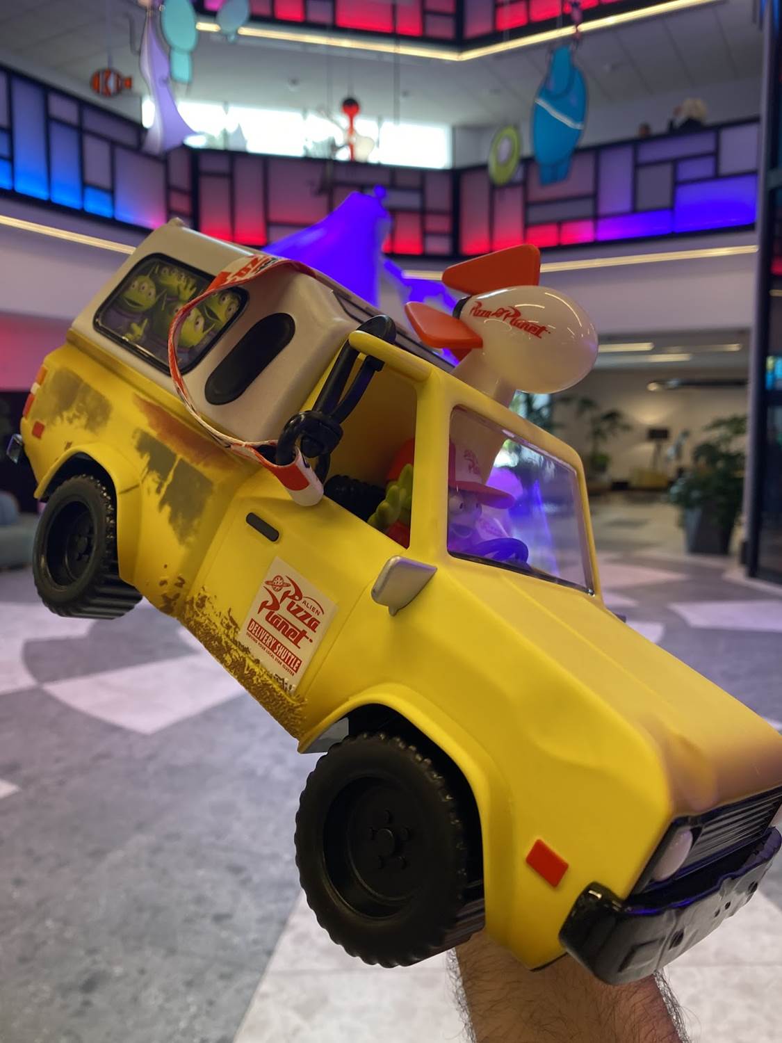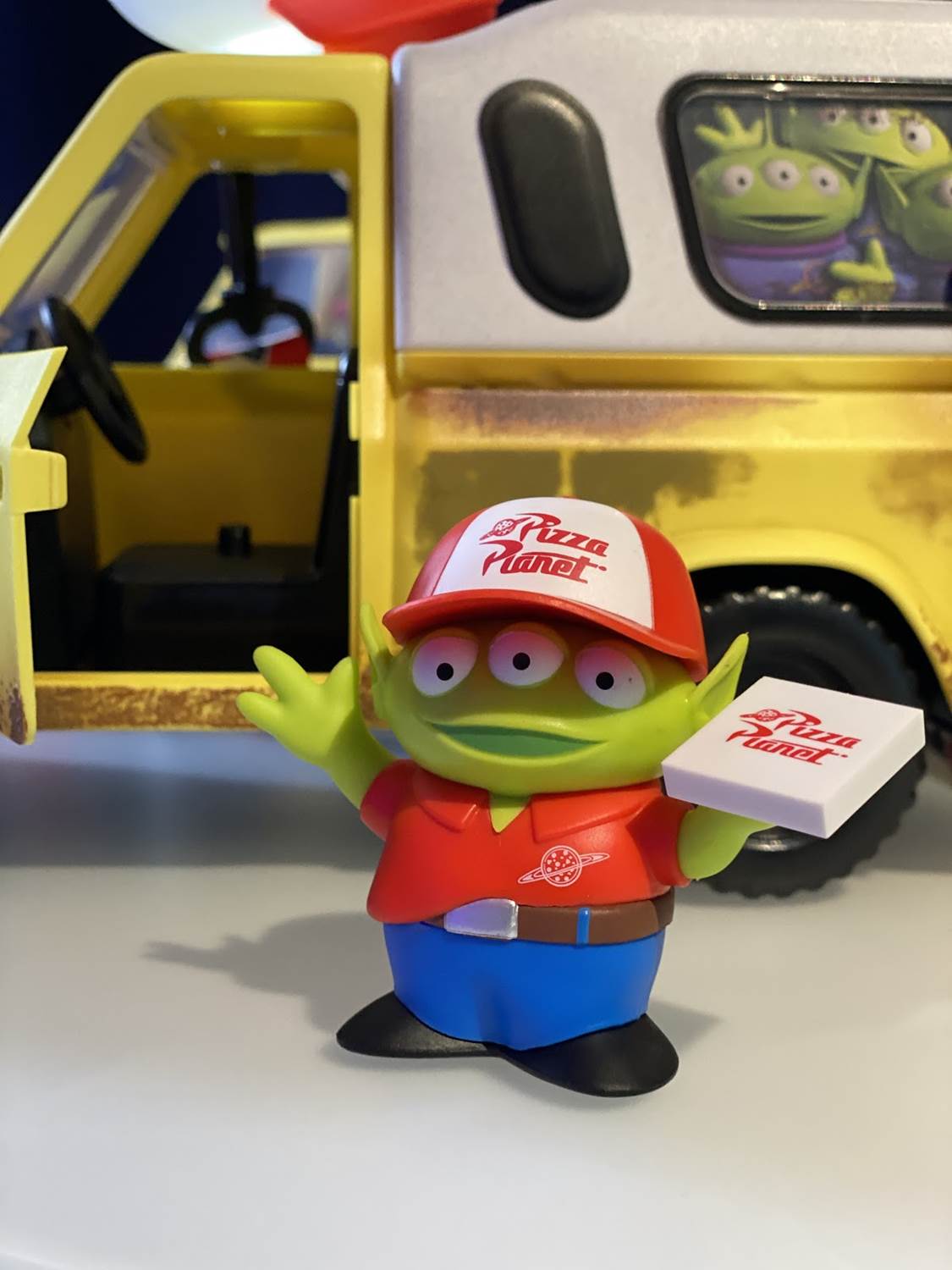 - In our post from Pixar Fest below, you can see that the truck features pull-back acceleration and also features a removable green alien driver, adorned in a Pizza Planet uniform.