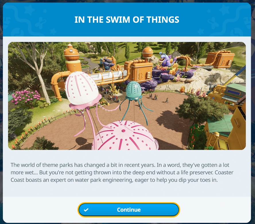 Jumping into In the Swim of Things, players will once again meet with Newton and Thompson as well as a new character Brad Newton. Known as “the Water Guy," Brad will walk you through building everything you need to operate a water park. First up, players will need to build changing rooms, a guest service station to sell passes for the water park, and a dryer. Then it’s time to build your first pool. I was shocked at how many guests quickly flooded into the pool before I was even onto the next step of the tutorial. Building pools is very similar to building paths, with different shapes and construction tools. Just like with the power system, players will also have to build water pumps and water filtration systems and connect them to pools throughout the water park. While I appreciate the commitment to accuracy, some of the new logistic functions began to overwhelm me as the game was introducing all of the new content. Players will also need to hire lifeguards, as guests do begin to “struggle" in the water occasionally.