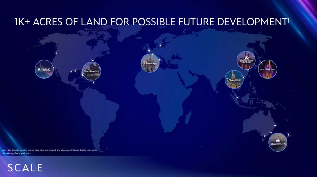 - On the note of “expanding footprint," another slide not only highlights Disney’s existing Parks locations and Cruise Line ports but also states that the company has more than 1,000 acres of land that could be developed for possible expansion.