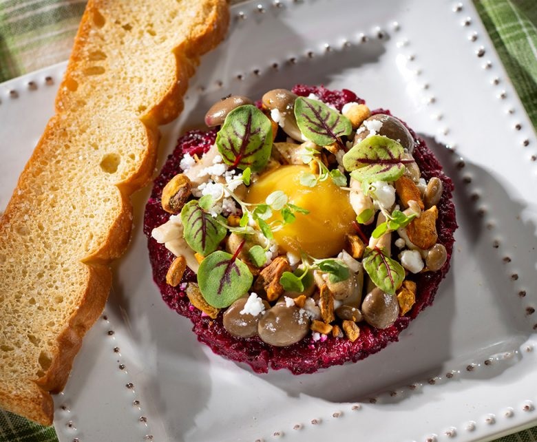 - Citrus-braised Beet Tartare with golden beet “egg yolk," mustard vinaigrette, pickled mustard seeds, pickled mushrooms, spiced pistachios, and “feta" snow (Found in Canada)