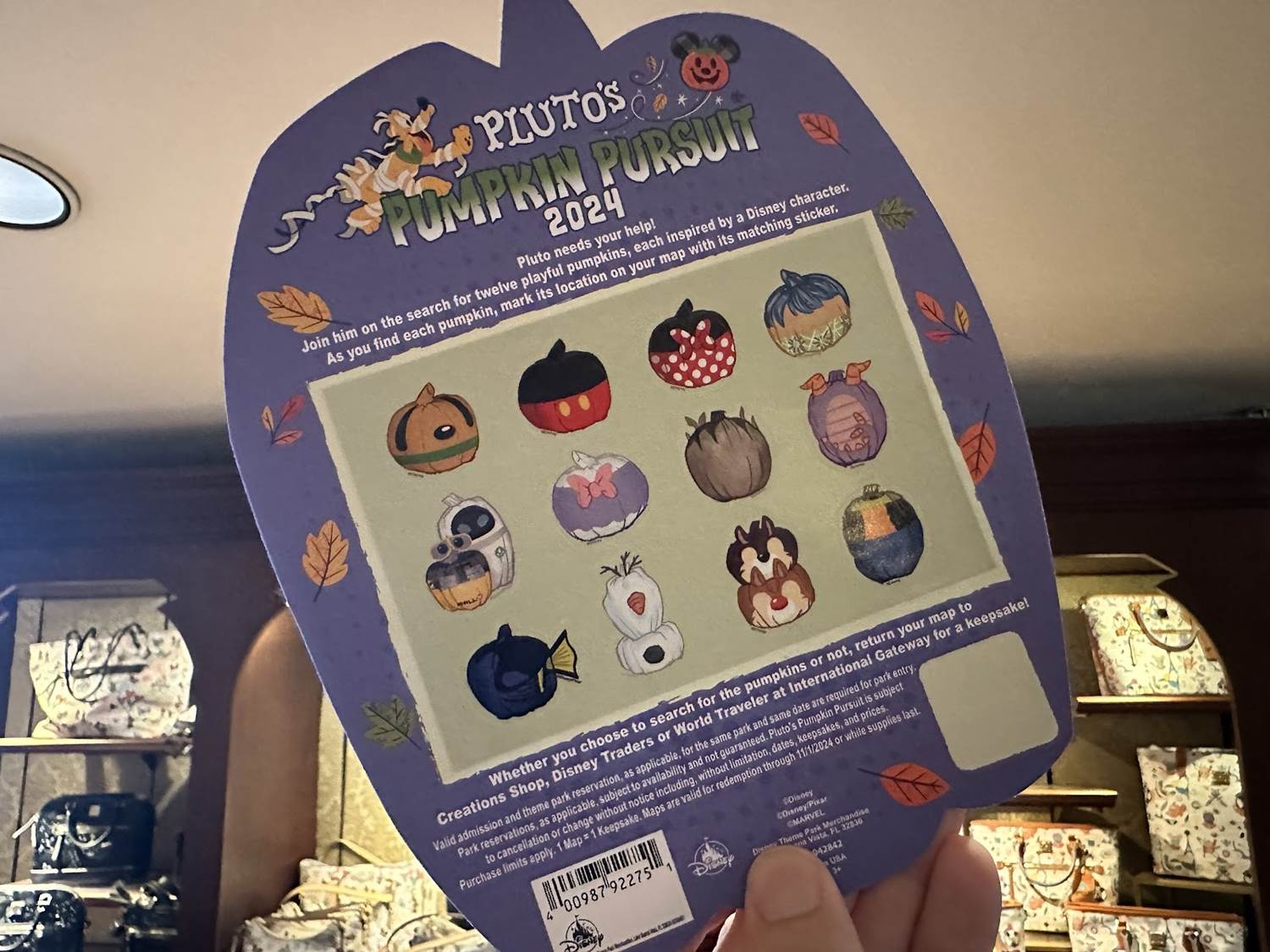 Guests start their journey by picking up an event card at select retail locations, typically at the Creations Shop, Port of Entry, and World Traveler. With this card, coming at an additional cost, guests are sent throughout the park to look for pumpkins that they can keep track of as their journey progresses.