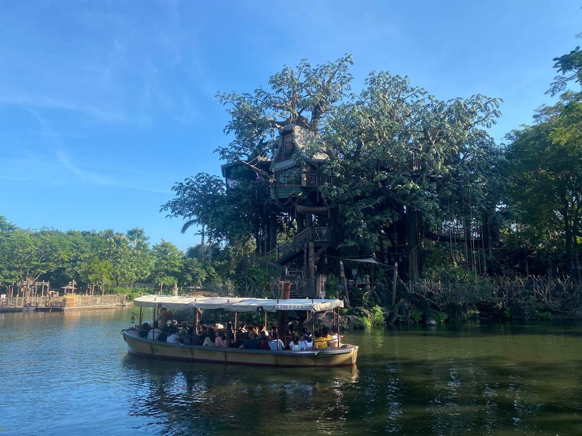 Perhaps the most unique iteration of the Jungle (River) Cruise can be found at Hong Kong Disneyland. Instead of the station being set back, this version is right in the center of Adventureland, in what would be the Rivers of America in other Magic Kingdom style parks. The boats begin by encircling Tarzan’s Treehouse along a wide riverbed, before the path narrows and we go through many familiar scenes – including the elephants bathing, the lost Safari, African veldt, and more. The attraction uniquely ends with a fiery and water-filled scene in front of a cave, where we come face-to-face with two gods feuding. It’s a unique, and explosive way to end the attraction!