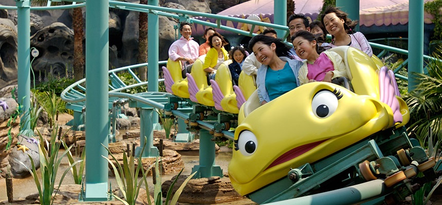 Flounder’s Flying Fish Coaster is similar to Gadget’s Go-Coaster at the neighboring Tokyo Disneyland, but does offer up a slightly different layout and experience. The attraction is cleverly set down into a lowered area, making it appear even smaller than it actually is – making it a great first-time coaster experience for the little ones.