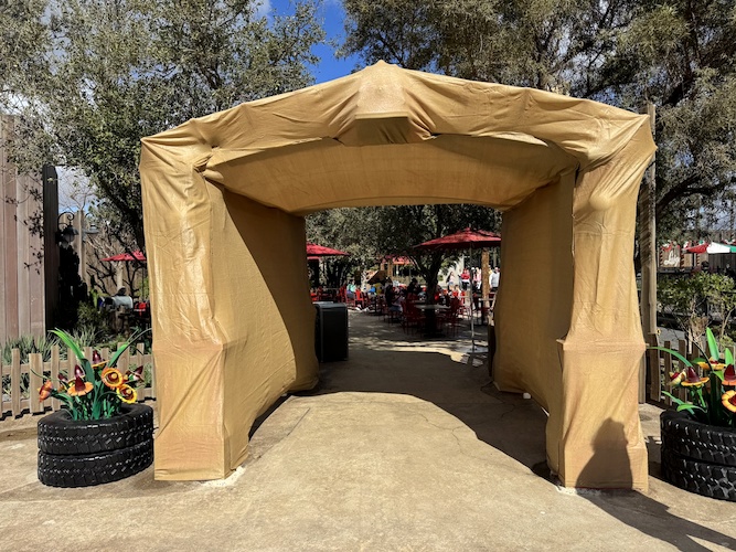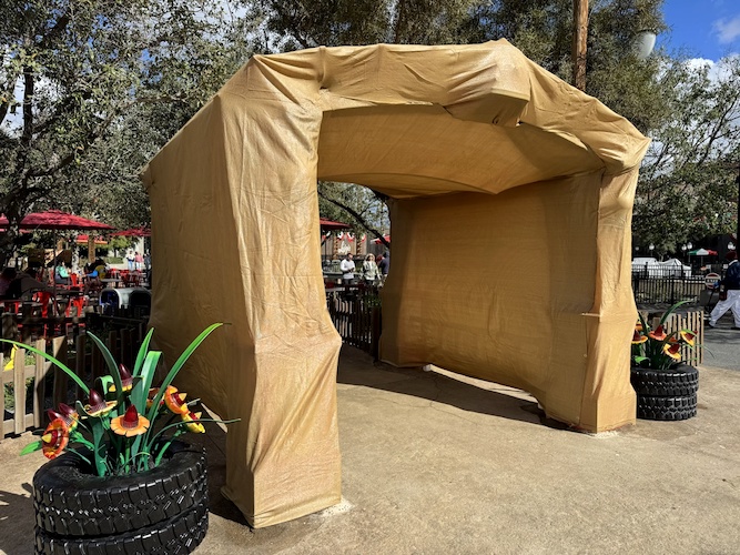 Photos: Recently-Installed Red’s Community Garden Archway Already Covered in Tarps at Cars Land