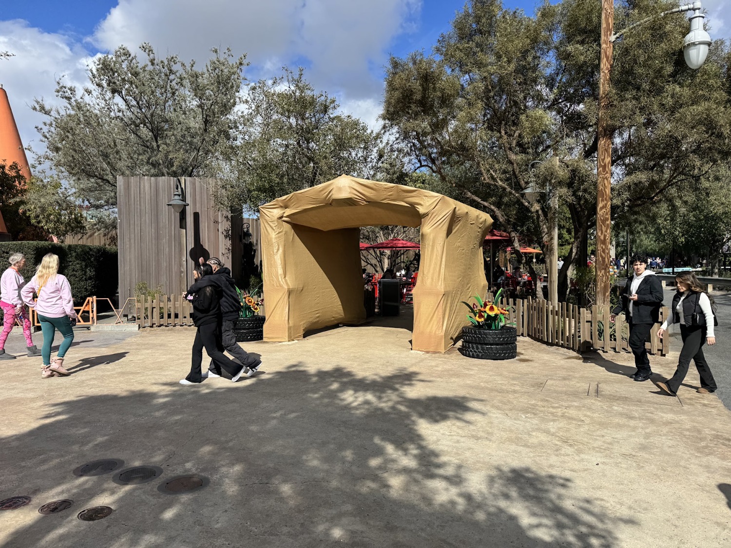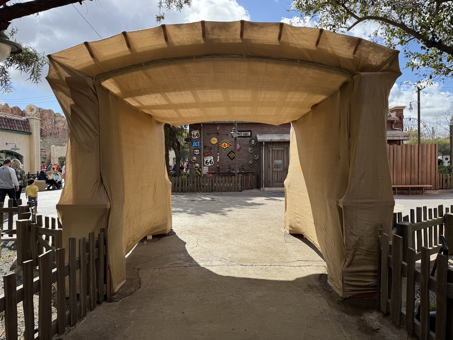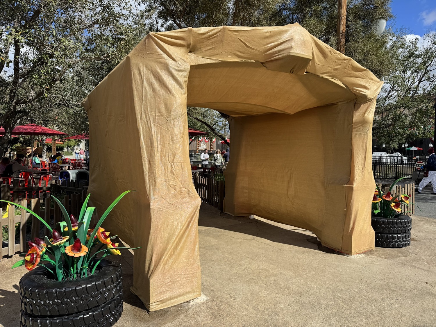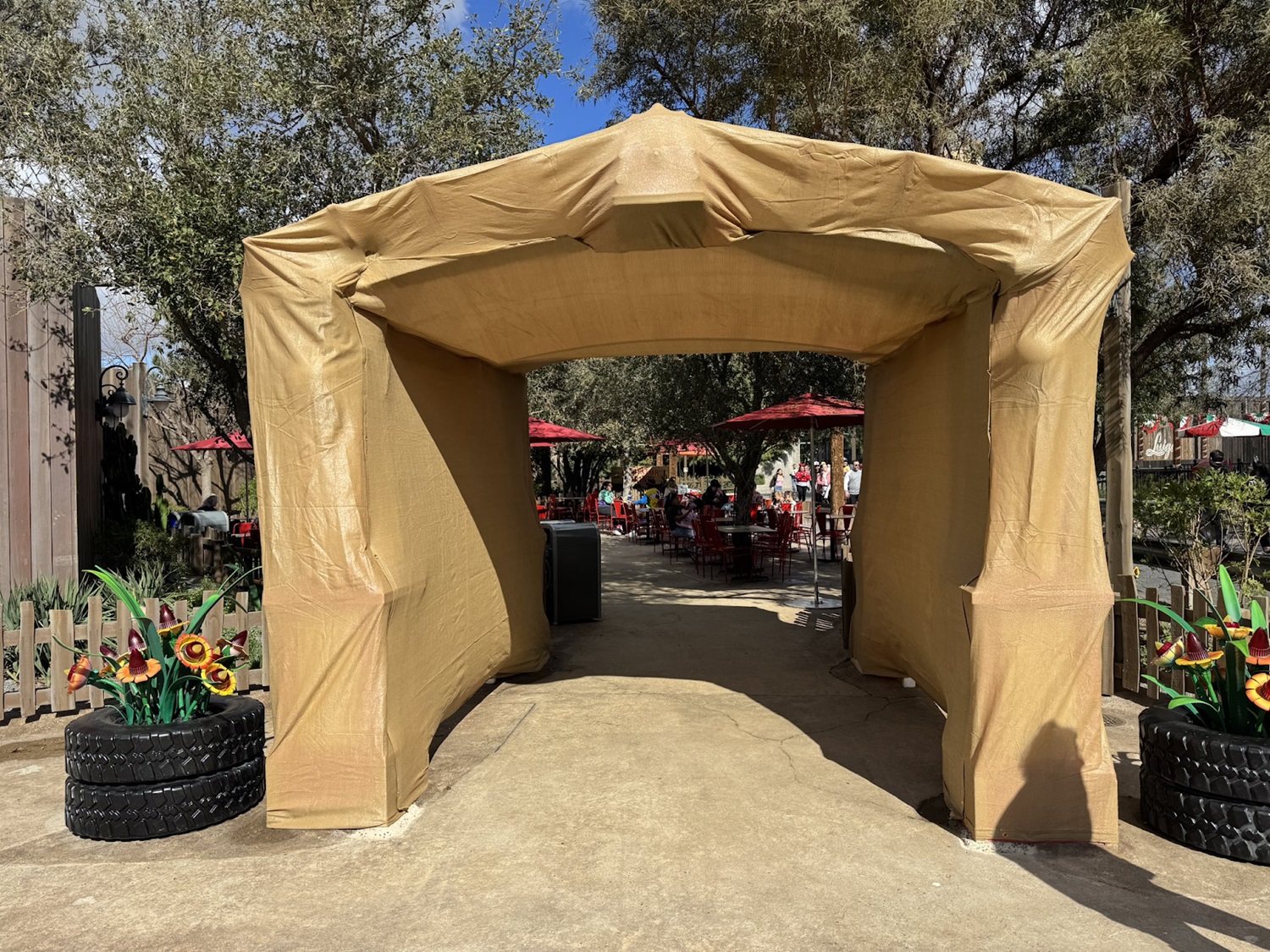 Photos: Recently-Installed Red’s Community Garden Archway Already Covered in Tarps at Cars Land