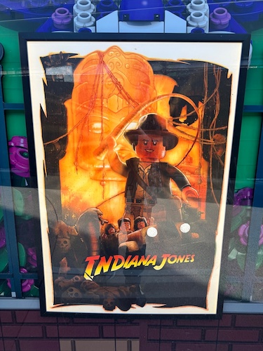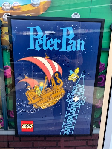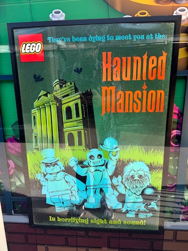 Outside the store, the immediate highlight are LEGO versions of some classic Disneyland attraction posters. The first window display features LEGO versions of the posters for The Haunted Mansion, Indiana Jones Adventure and Peter Pan’s Flight.