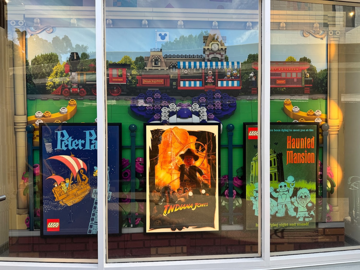 Outside the store, the immediate highlight are LEGO versions of some classic Disneyland attraction posters. The first window display features LEGO versions of the posters for The Haunted Mansion, Indiana Jones Adventure and Peter Pan’s Flight.