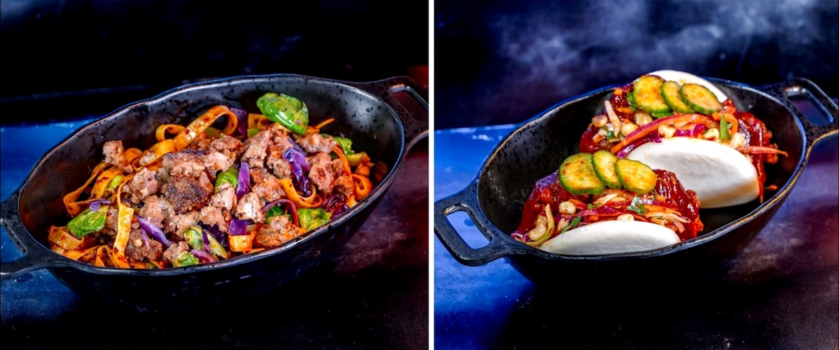 - Dewback Chili Noodles: Spiced fettuccine noodles and gingered ground pork with brussels sprout leaves and shredded red cabbage