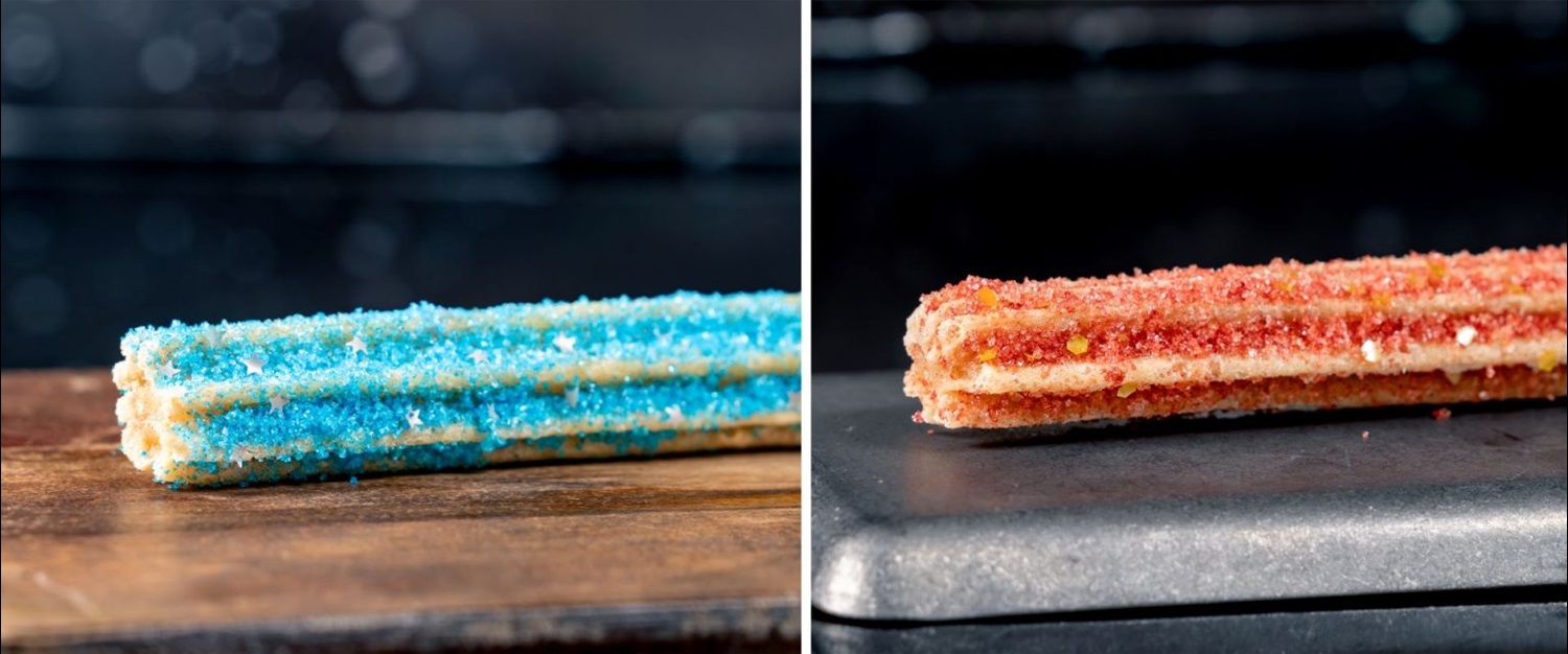 - Spiced Red Cinnamon Churro: Classic churro rolled in red hot cinnamon and gold edible glitter sugar